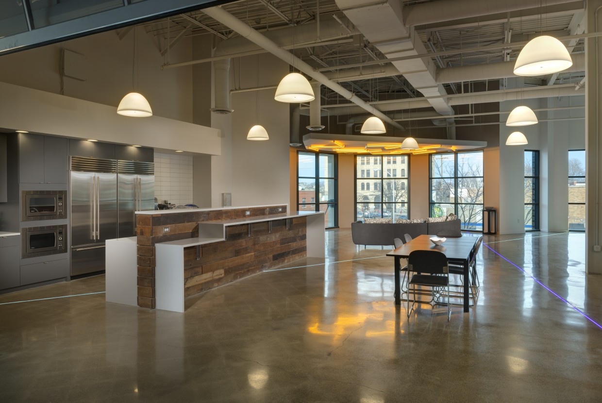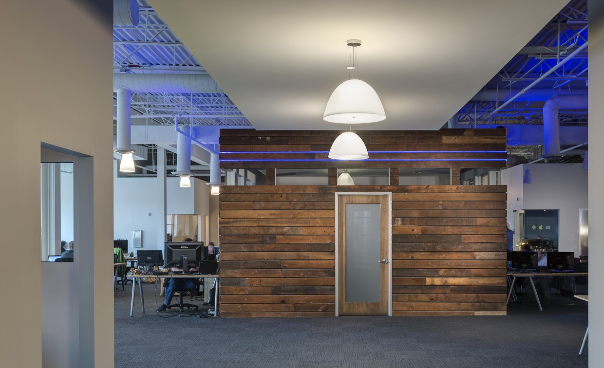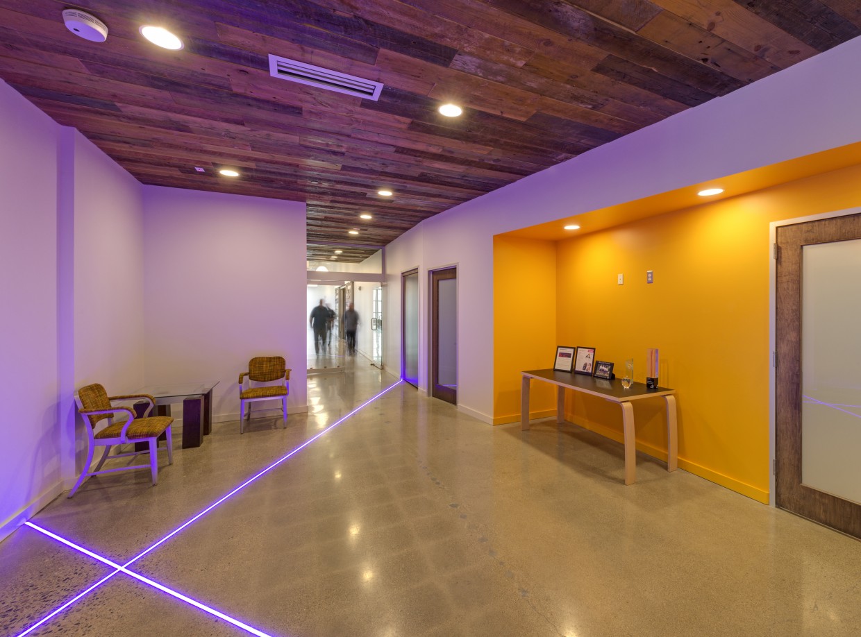 To showcase the company’s youth, vibrancy and energy, raw material finishes and high-tech accents were used. The ceilings and structure were left exposed to create a loft-like space while polished concrete and reclaimed wood finishes give a utilitarian feel. Contemporary lighting, brushed aluminum trim, and color-changing LED strips were installed in floors and walls to bring dynamic accents to the workspace.