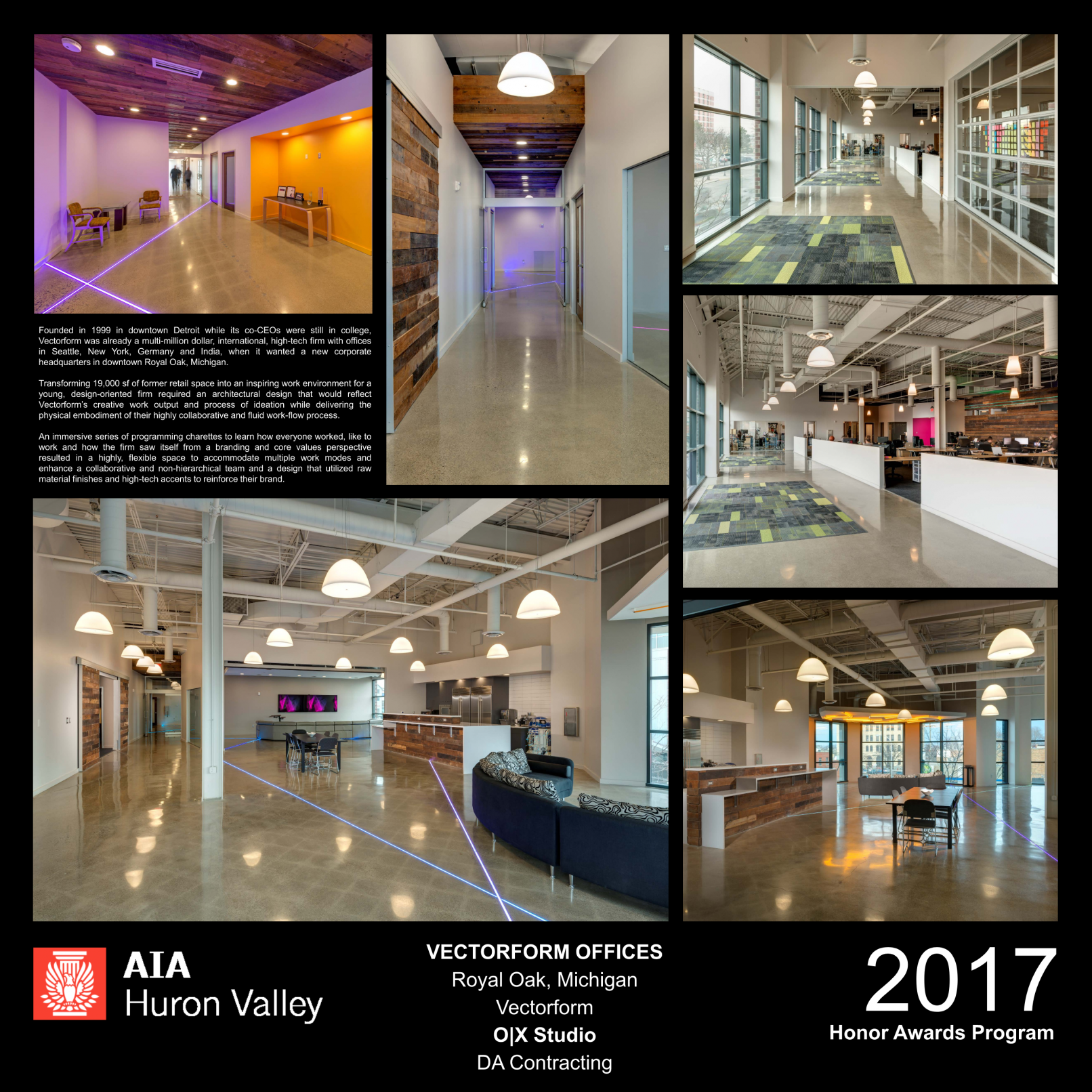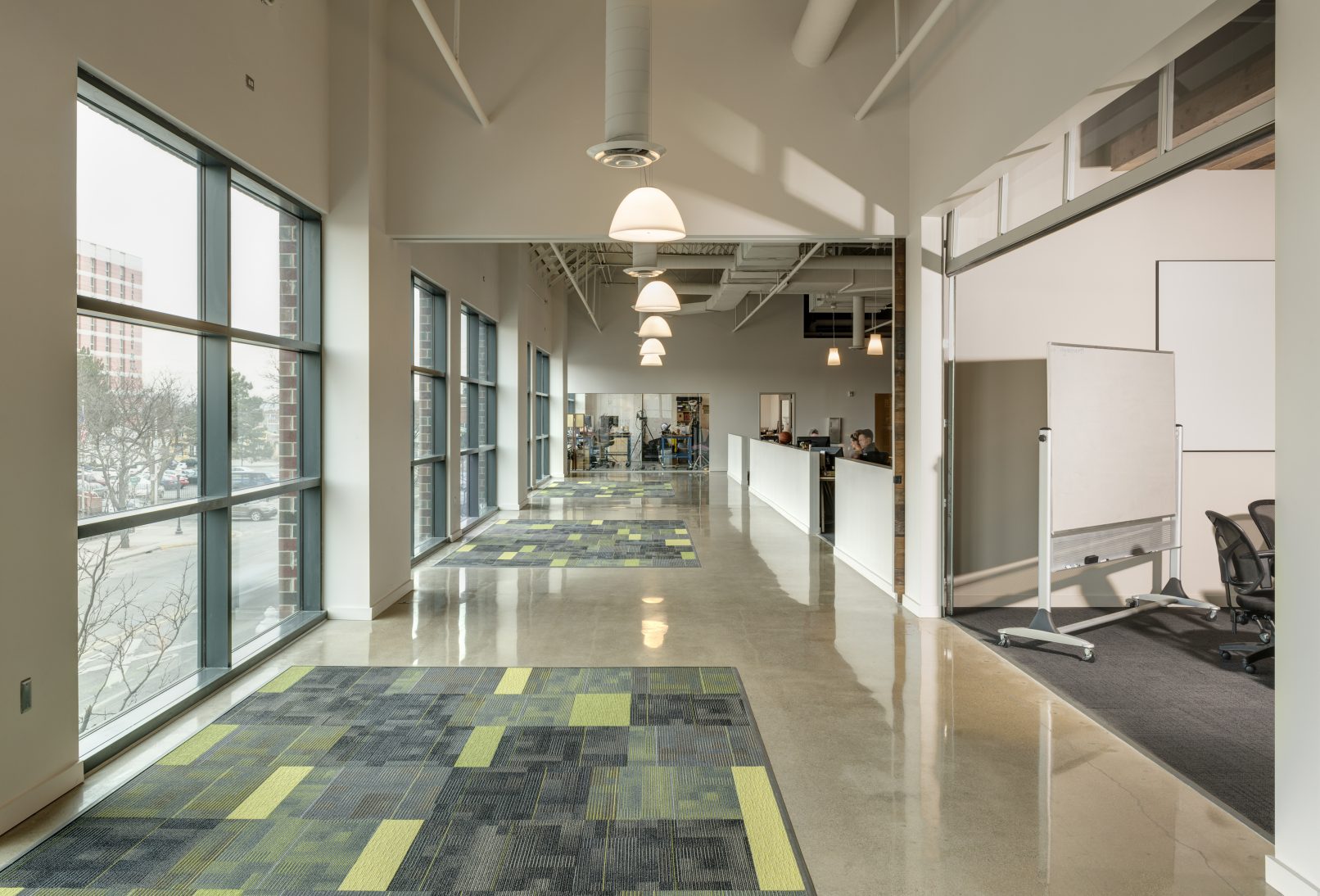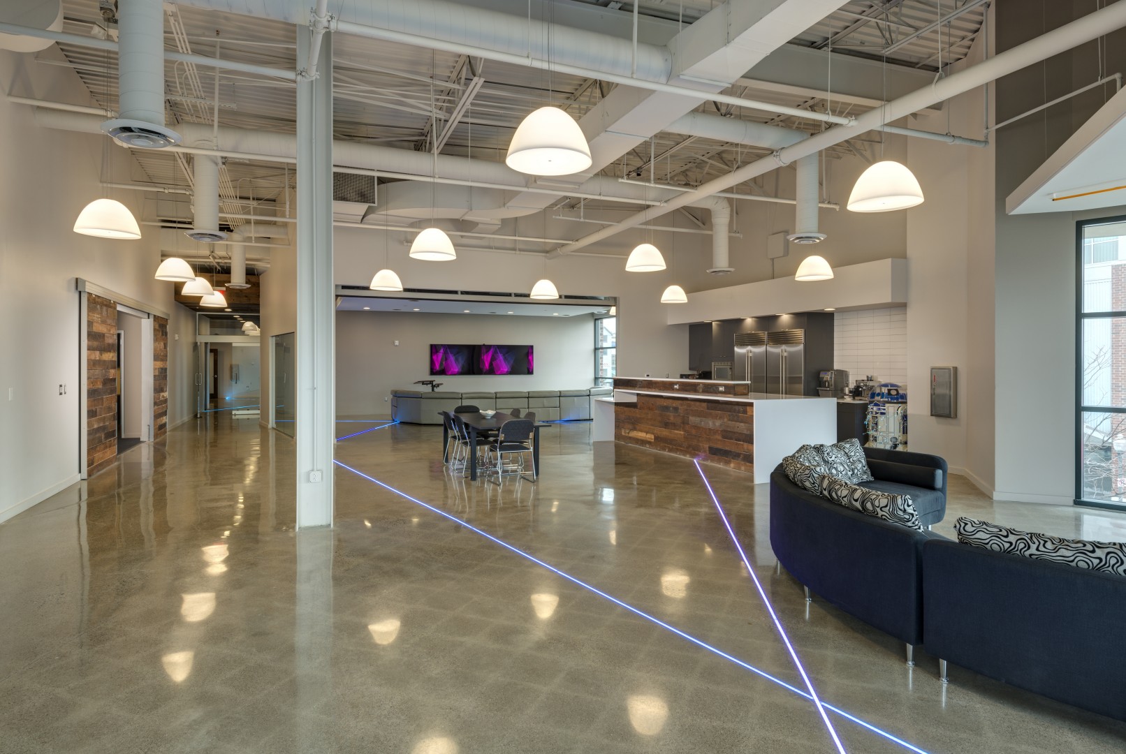 To showcase the company’s youth, vibrancy and energy, raw material finishes and high-tech accents were used. The ceilings and structure were left exposed to create a loft-like space while polished concrete and reclaimed wood finishes give a utilitarian feel. Contemporary lighting, brushed aluminum trim, and color-changing LED strips were installed in floors and walls to bring dynamic accents to the workspace.