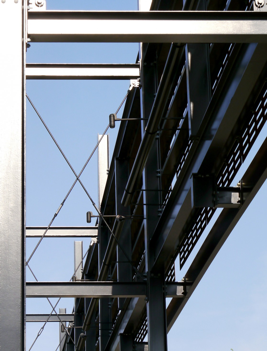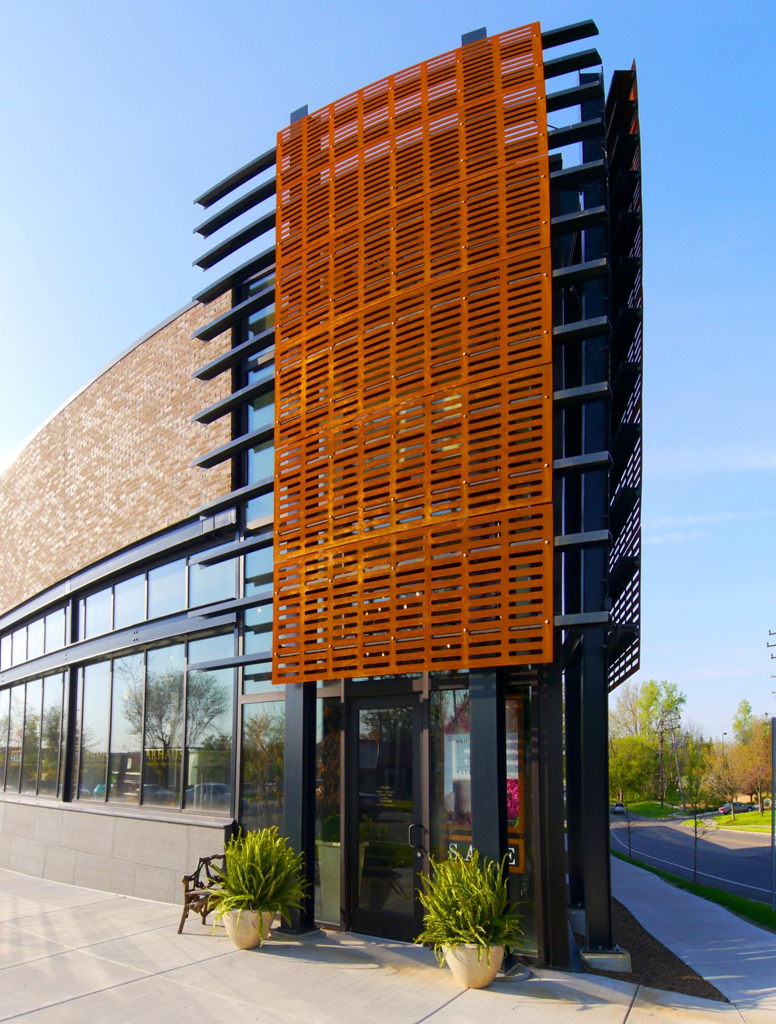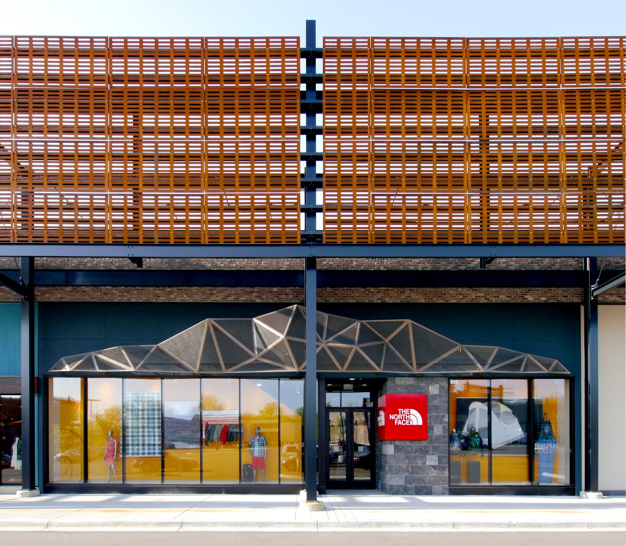 The shopping center also provides office space. Located above the retail anchor, access is via its own entry with a vertical component to help delineate the different space.