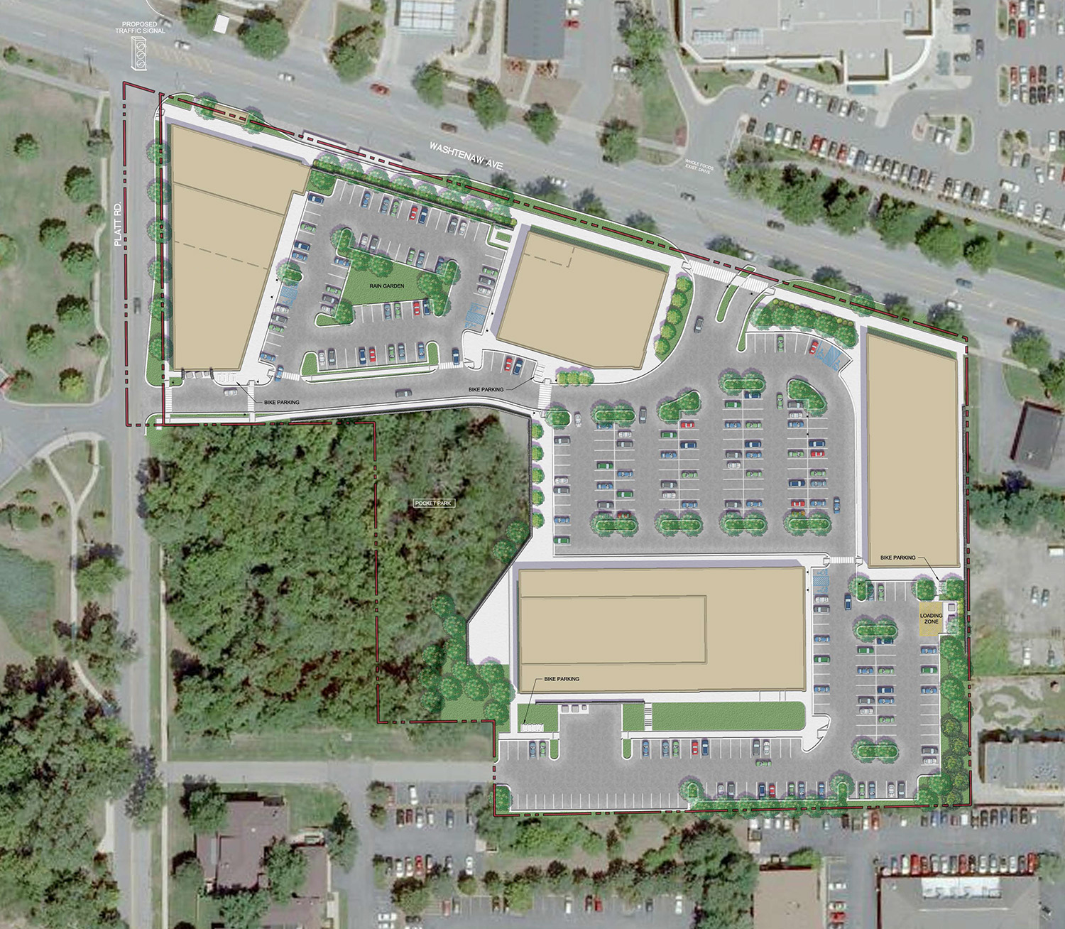 The complex’s four buildings were sited to set the stage for a hybrid adaptation and overall site concept that would create a distinct departure from the standard retail concept. To create a definable, urban edge condition, three of the buildings were pushed directly to the site boundaries. The fourth building was set deeper into the site and operates as a ‘billboard’ device to frame the backdrop of the center. The staging and placement of the buildings allowed the spaces in between to become individual vignettes, each with their own program and parking arrangements.