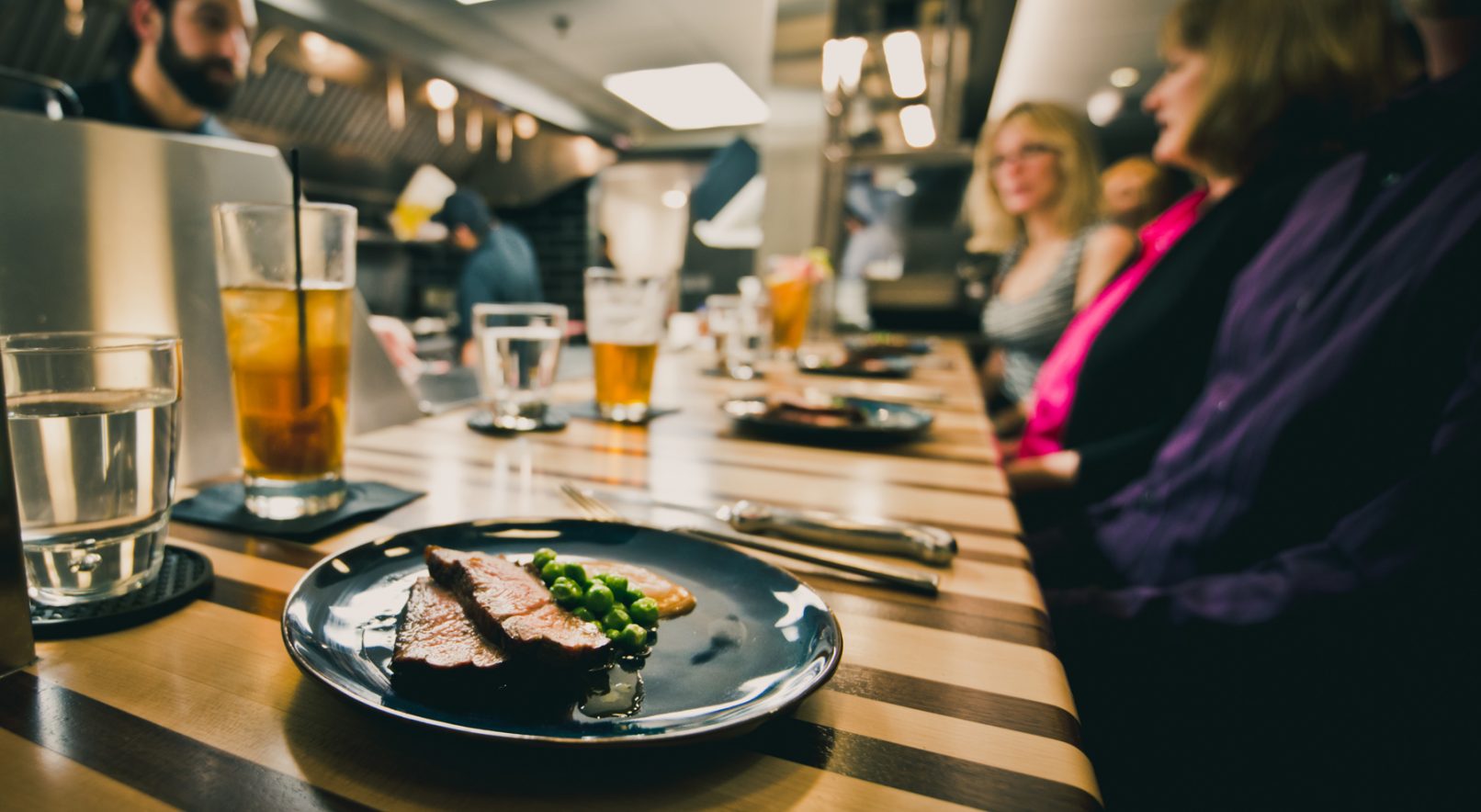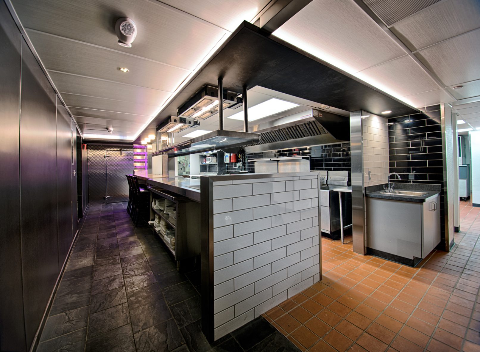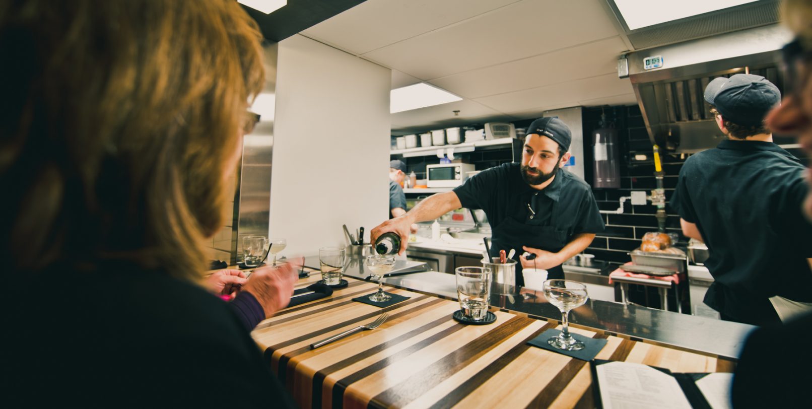 Dining at the chef’s counter is an active part of the design intent to stage the guests with a framed perspective allowing them to experience the actors of a commercial kitchen. The walnut and maple butcher block counter and seating area, cantilevered micro-greens planter and lighting frame the opening to the kitchen and centers the diners’ view on the chef.