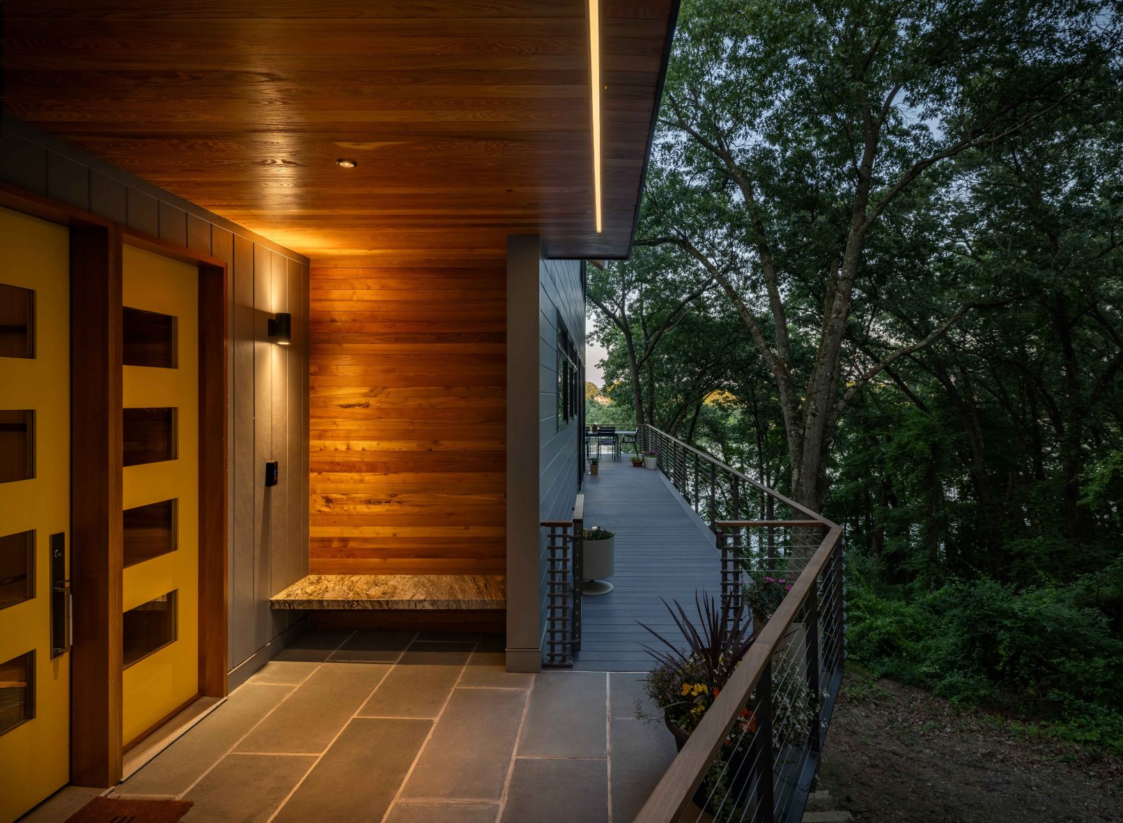 - Strategically orienting views to the south and east, paired with deep overhangs for natural light and shade.