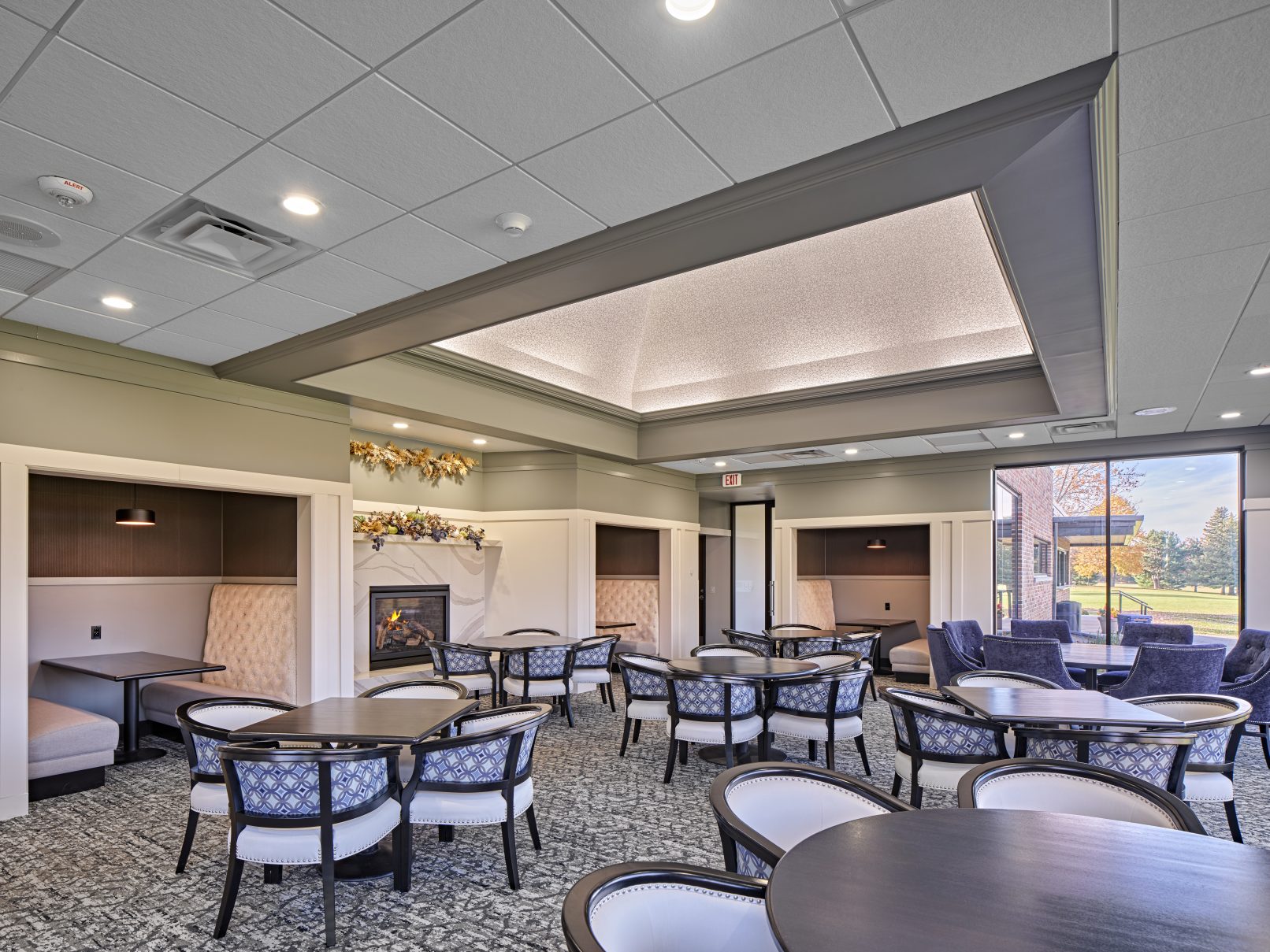 The new design establishes a clear central hub by creating a new entry sequence and lobby. The bar—previously tucked away—is repositioned front and center, offering a lively focal point visible as soon as members walk in. New dining areas support both large gatherings and smaller private experiences, and a custom golf simulator room, acoustically isolated from the main space, adds a contemporary amenity.
