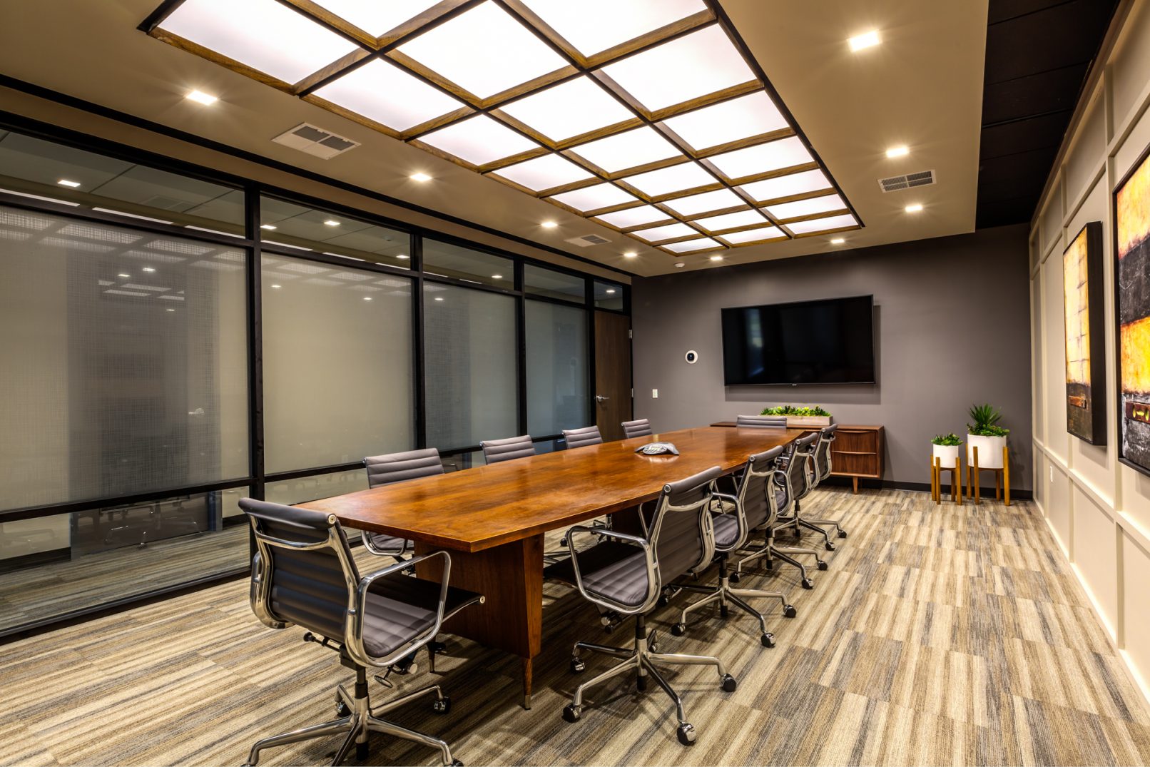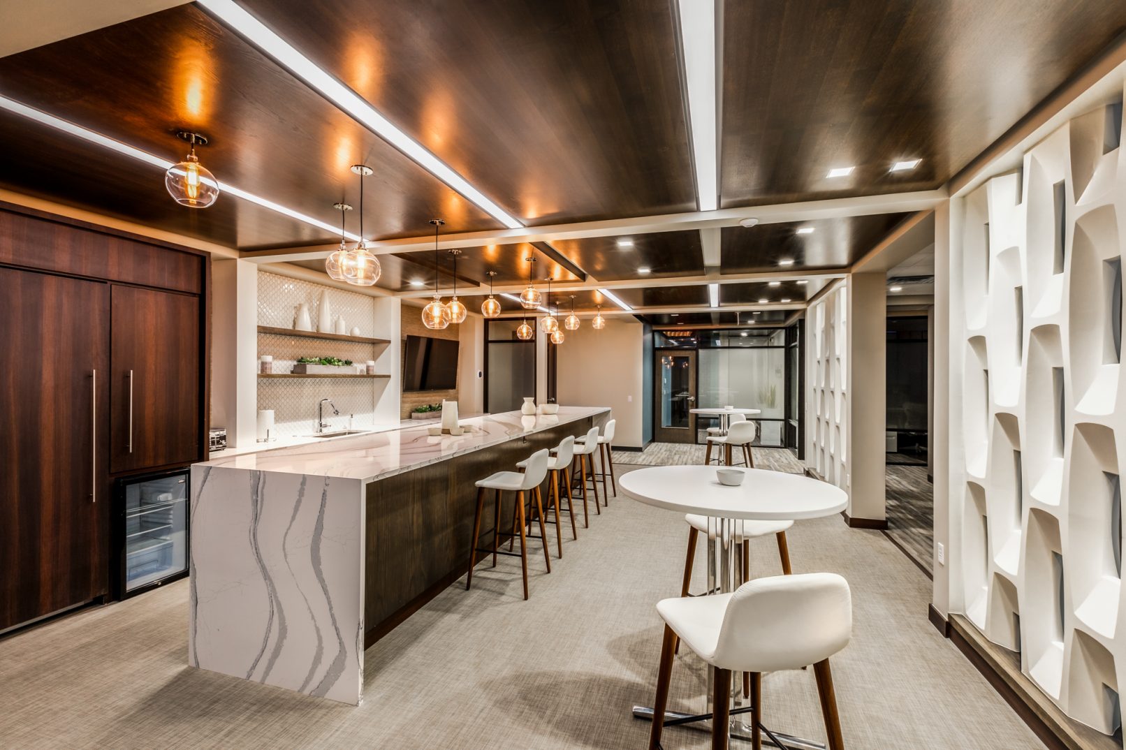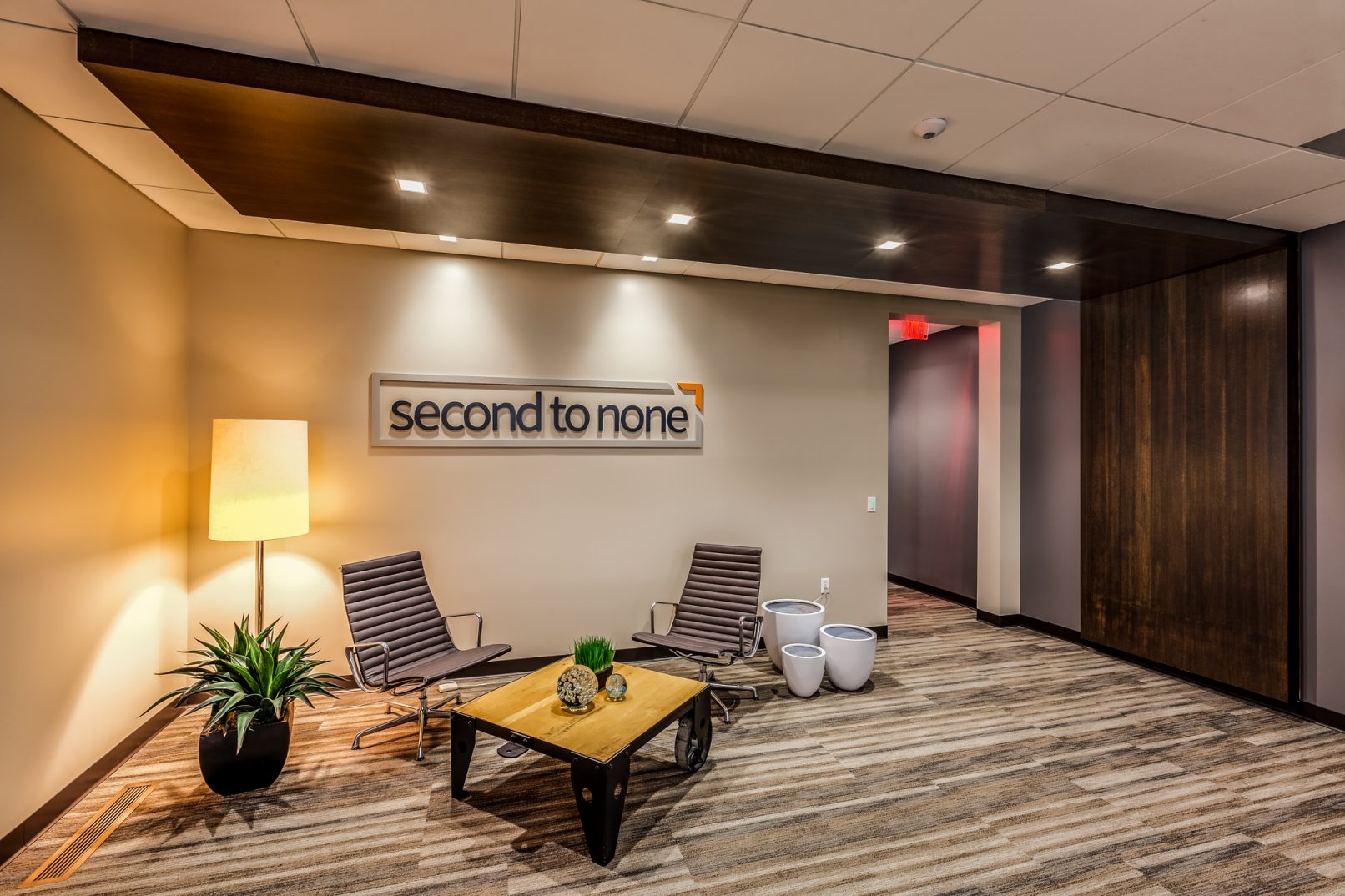 Second To None’s new workspace was designed from the center-out. The combination kitchen and break area lay at the heart of the building and is the first space viewed when entering from the primary employee entrance. It was intended to serve as a space to maximize chance interactions over the course of a workday. The kitchen island runs nearly the full depth of the space, offering users a respite from their desks as well as a place for informal gathering. Veneered panels add depth to the ceiling and flow through the vestibule, inviting employees into the space, while simple glass pendants add a measure of decorative sparkle. Sculptural screen walls provide delineation and a visual stop to the break area, without diminishing the airy, open qualities of the room.