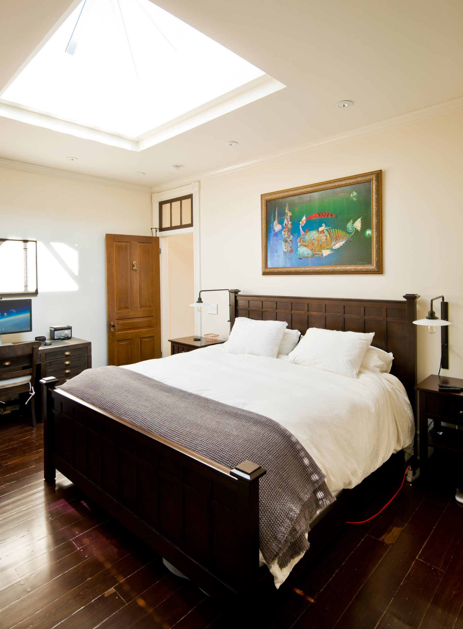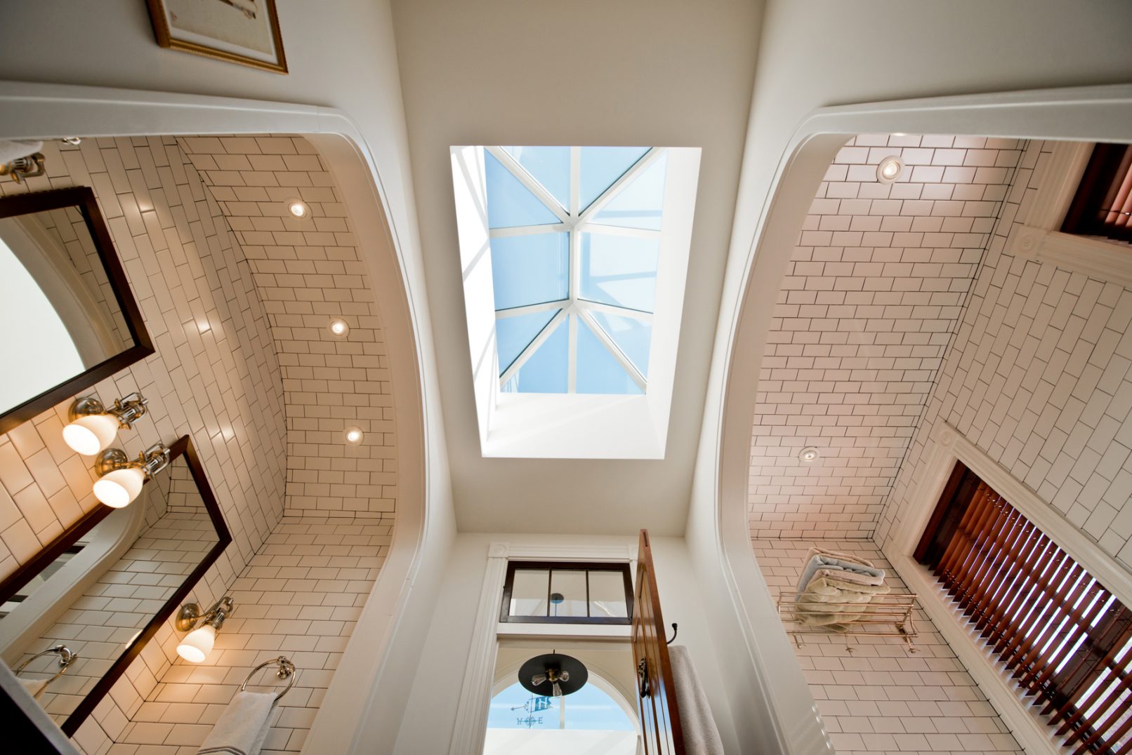 Three, large skylights installed in the atrium, master bathroom, and rear bedroom flood the home with light, and the third floor’s interior glass and arched openings help borrow the light and engage adjacent rooms throughout the house. In addition, the atrium’s colonnaded hallway and corridor allow for a visual connection between the second and third floors.