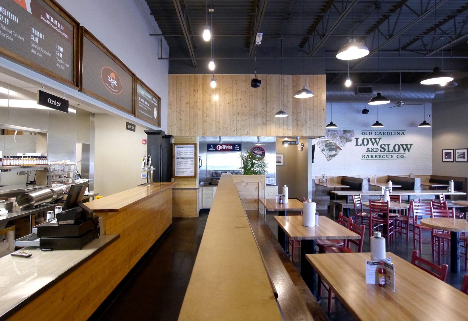 A Midwestern-based restaurant, Old Carolina BBQ combines the traditions of award-winning Carolina-style barbecue with an understanding of its local community. The Ann Arbor location is the franchise chain’s ninth restaurant and the first foray out of Ohio. With a desire to elevate the restaurant and serve as the “Cadillac” of the OCB brand, the owner veered away from the use of traditional materials and designs to create a more authentic country feel, including a shed-wood entrance, cordwood accent walls and spalted maple countertops made from local, urban forested wood.