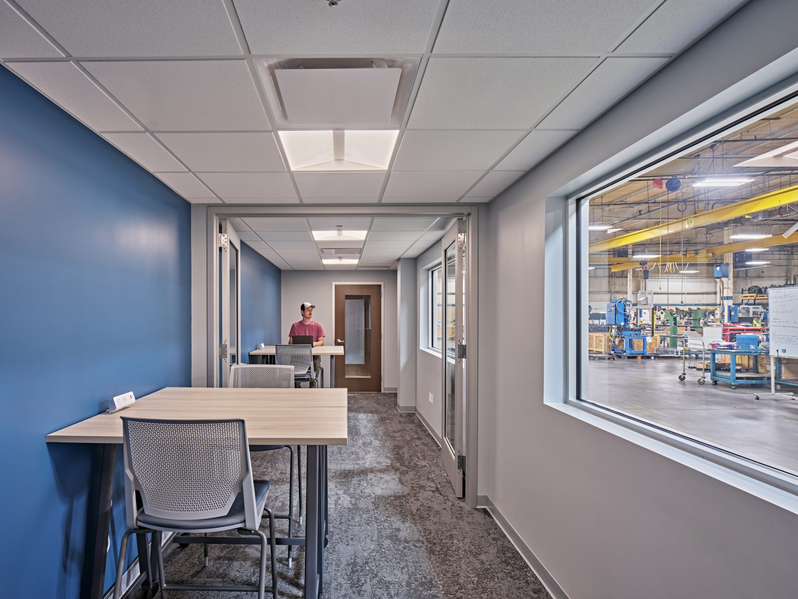 The Orbitform Office Renovation project seeks to enhance workspace efficiency through strategic floor plan adjustments, prioritizing increased natural light, and improved collaboration. The initial challenge of limited light was addressed by moving private offices inward, introducing storefronts for deeper daylight, and adding windows between the warehouse and offices. Informal collaboration areas cater to both office and factory staff. The redesigned floor plan centers around the Break Room as an activity hub, while relocating the main entry integrates the receptionist and maintains security. The design also includes a conference zone for visiting tradespeople. This renovation effectively balances functional improvements with design constraints, fostering a collaborative environment filled with natural light.