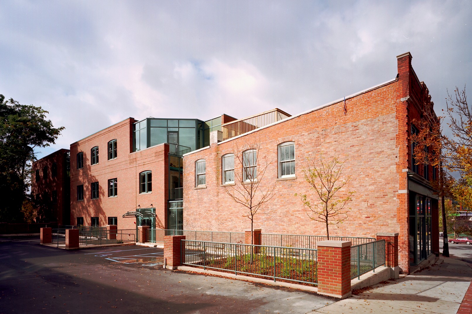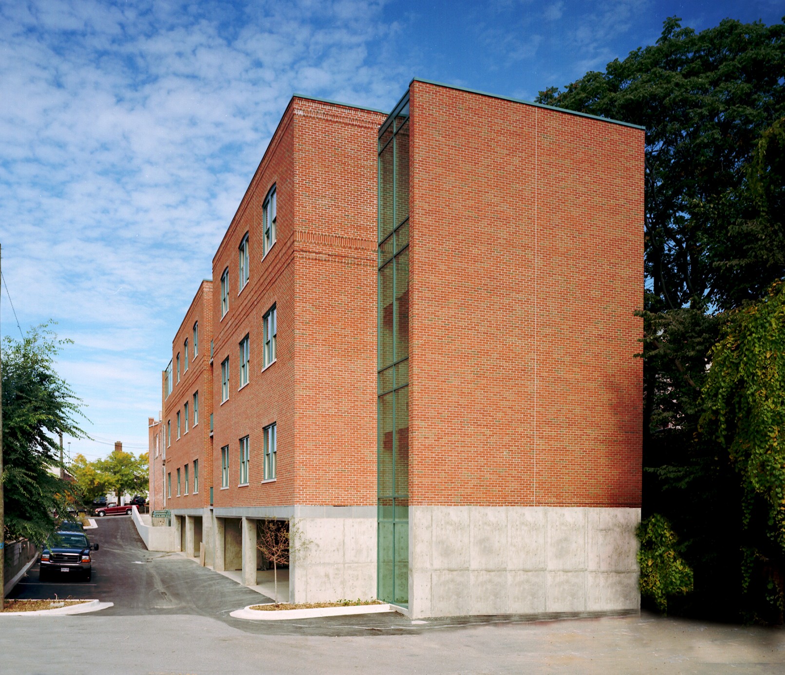 To prevent the addition from overpowering the historic structure, it was designed as two masonry masses separated by contemporary glass voids. In addition, because the site is located in the flood plain, the addition was raised off the ground and the resulting space is used for parking under the building.