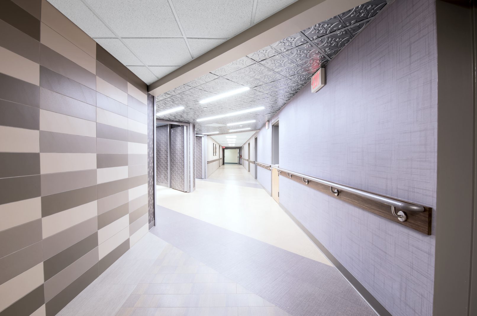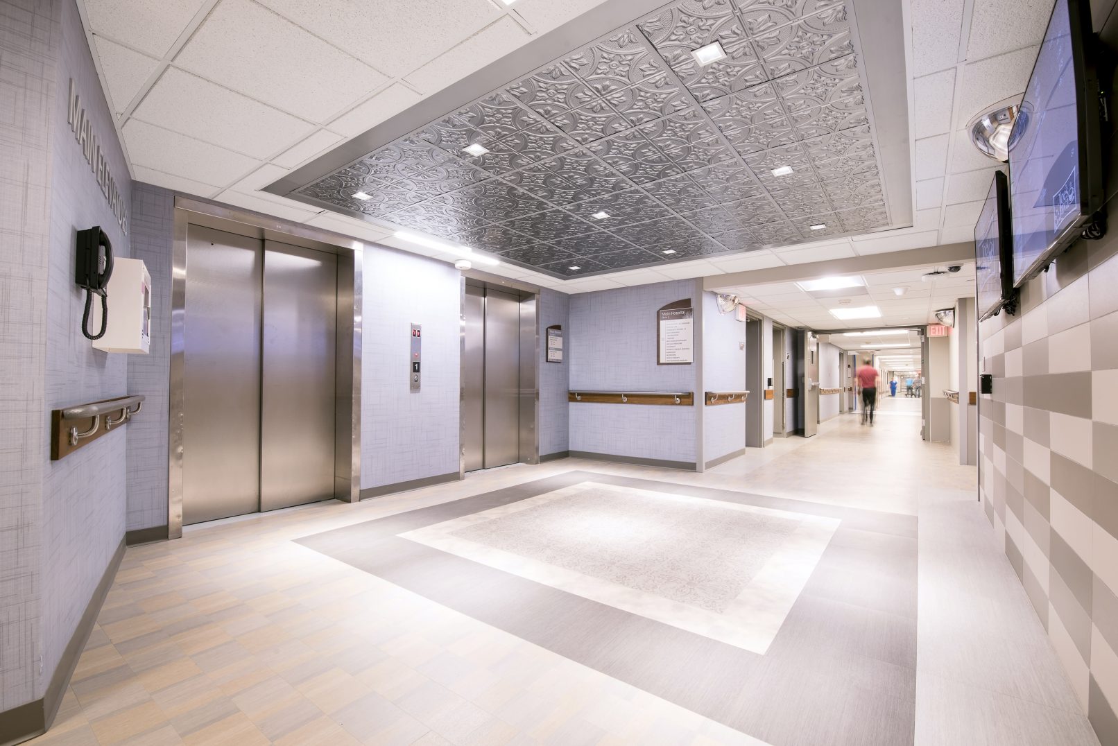 Using a variety of materials, finishes, flooring patterns, ceiling heights (to conceal system equipment), a warm color palette with cool accents and open spaces with strategically placed walls to create visual interest, the public spaces throughout the hospital were dramatically transformed to improve all aspects of the patient, visitor and staff experience.