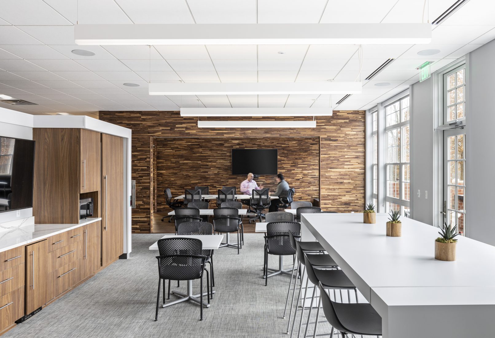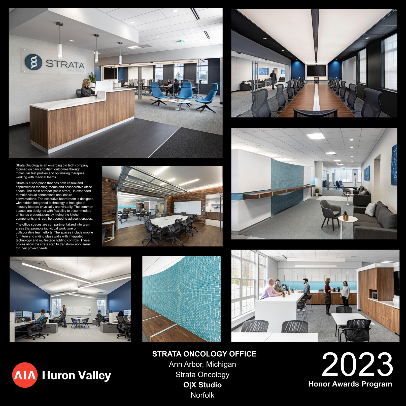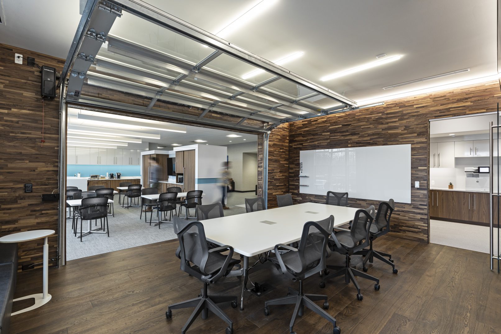 Strata is a workplace that has both casual and sophisticated meeting rooms and collaborative office space. The main corridor (main street) is expanded to make visual connections and inspire conversations. The executive board room is designed with hidden integrated technology to host global industry leaders physically and virtually. The common spaces are designed with the flexibility to accommodate all hands presentations by hiding the kitchen components and can be opened to adjacent spaces.