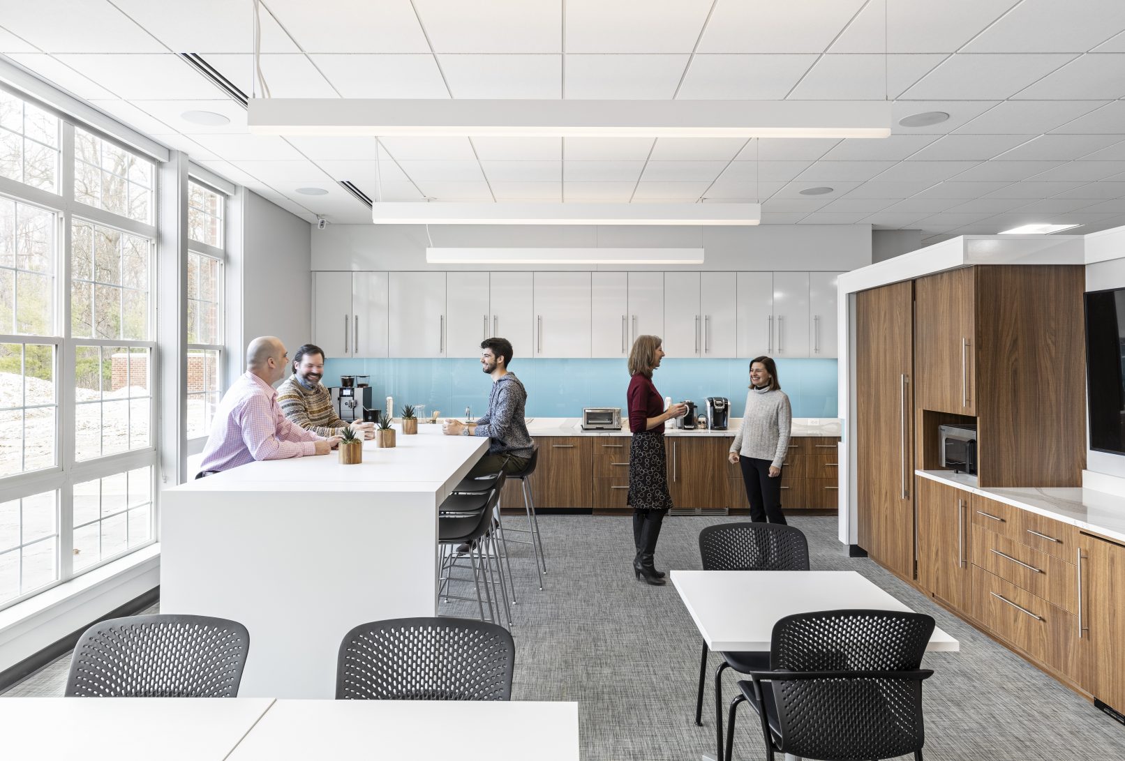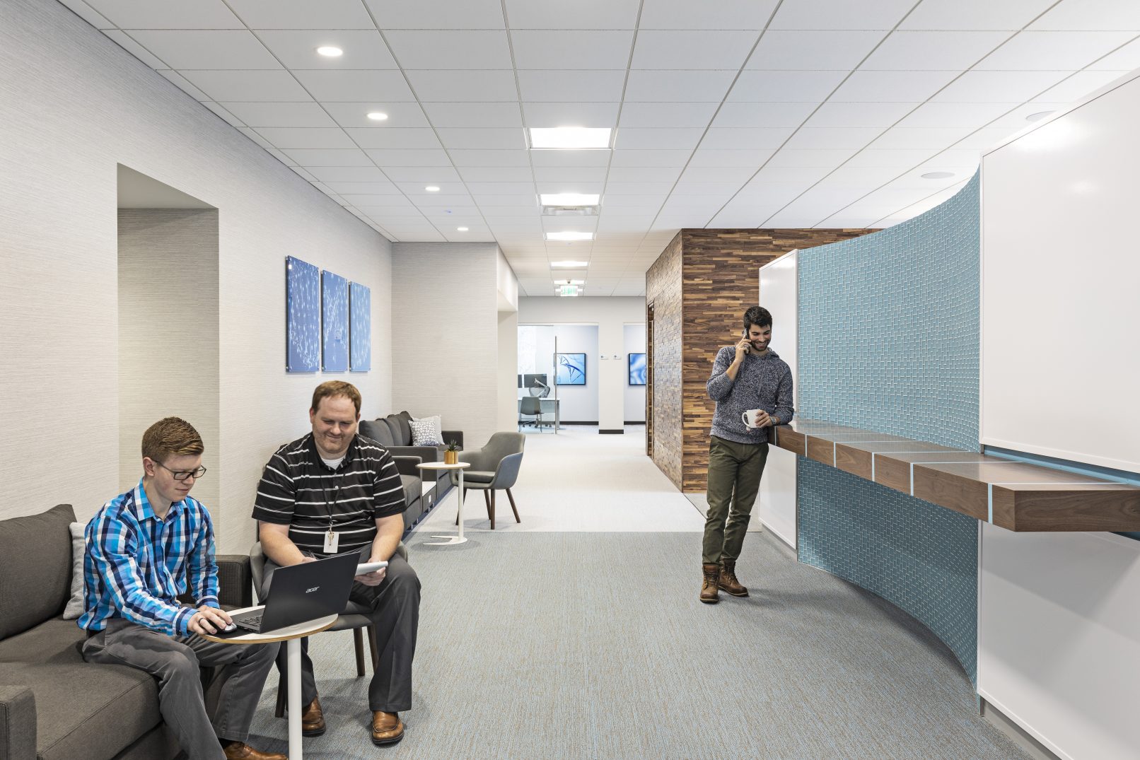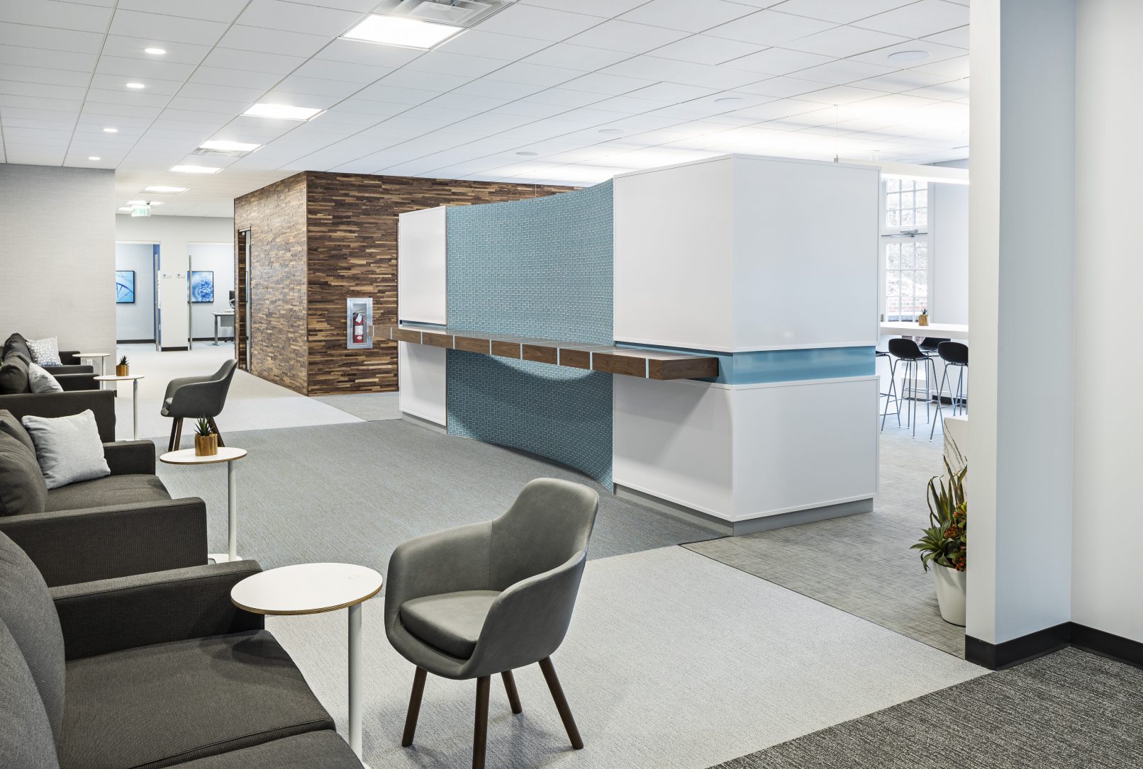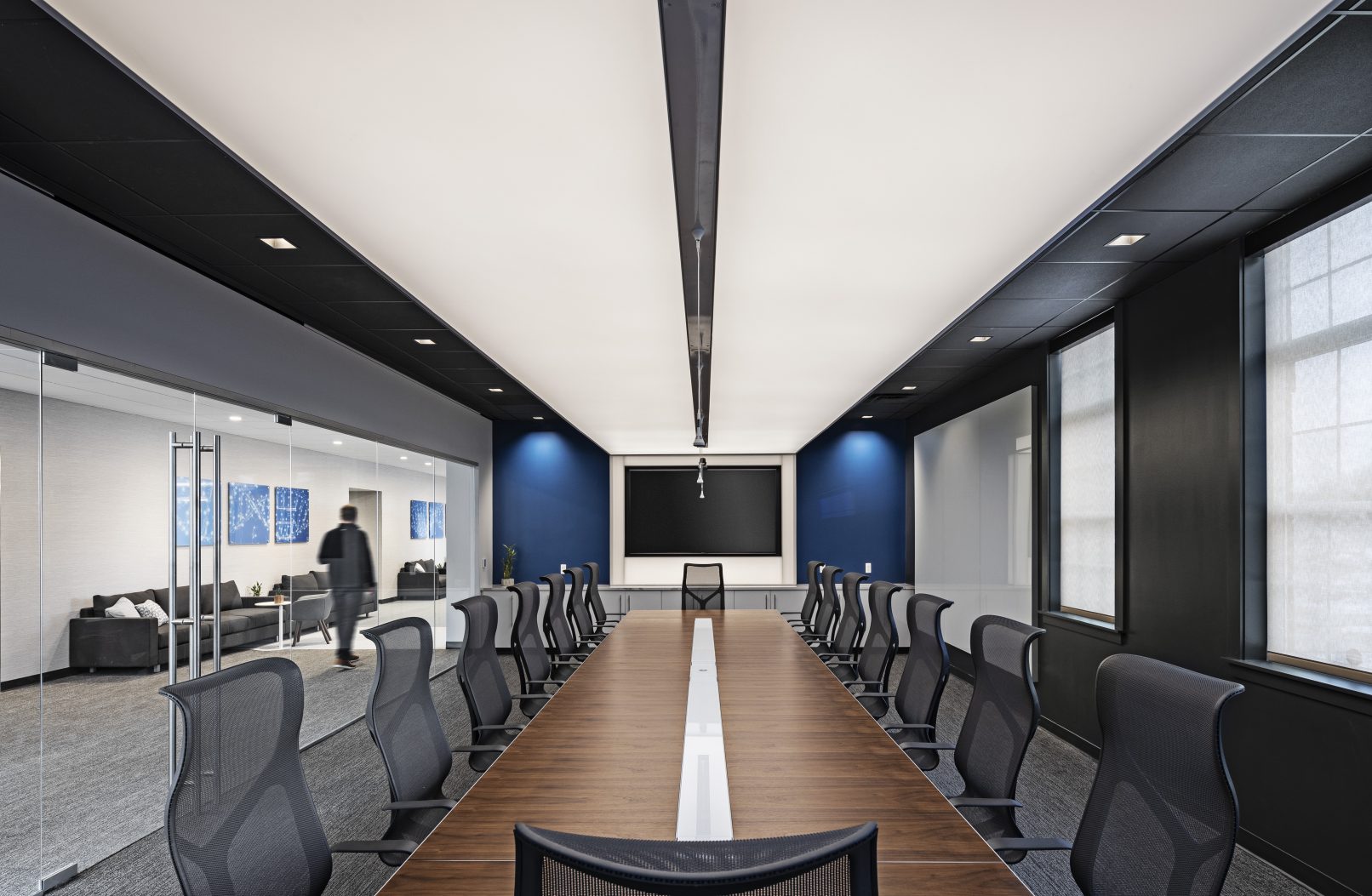 Strata is a workplace that has both casual and sophisticated meeting rooms and collaborative office space. The main corridor (main street) is expanded to make visual connections and inspire conversations. The executive board room is designed with hidden integrated technology to host global industry leaders physically and virtually. The common spaces are designed with the flexibility to accommodate all hands presentations by hiding the kitchen components and can be opened to adjacent spaces.