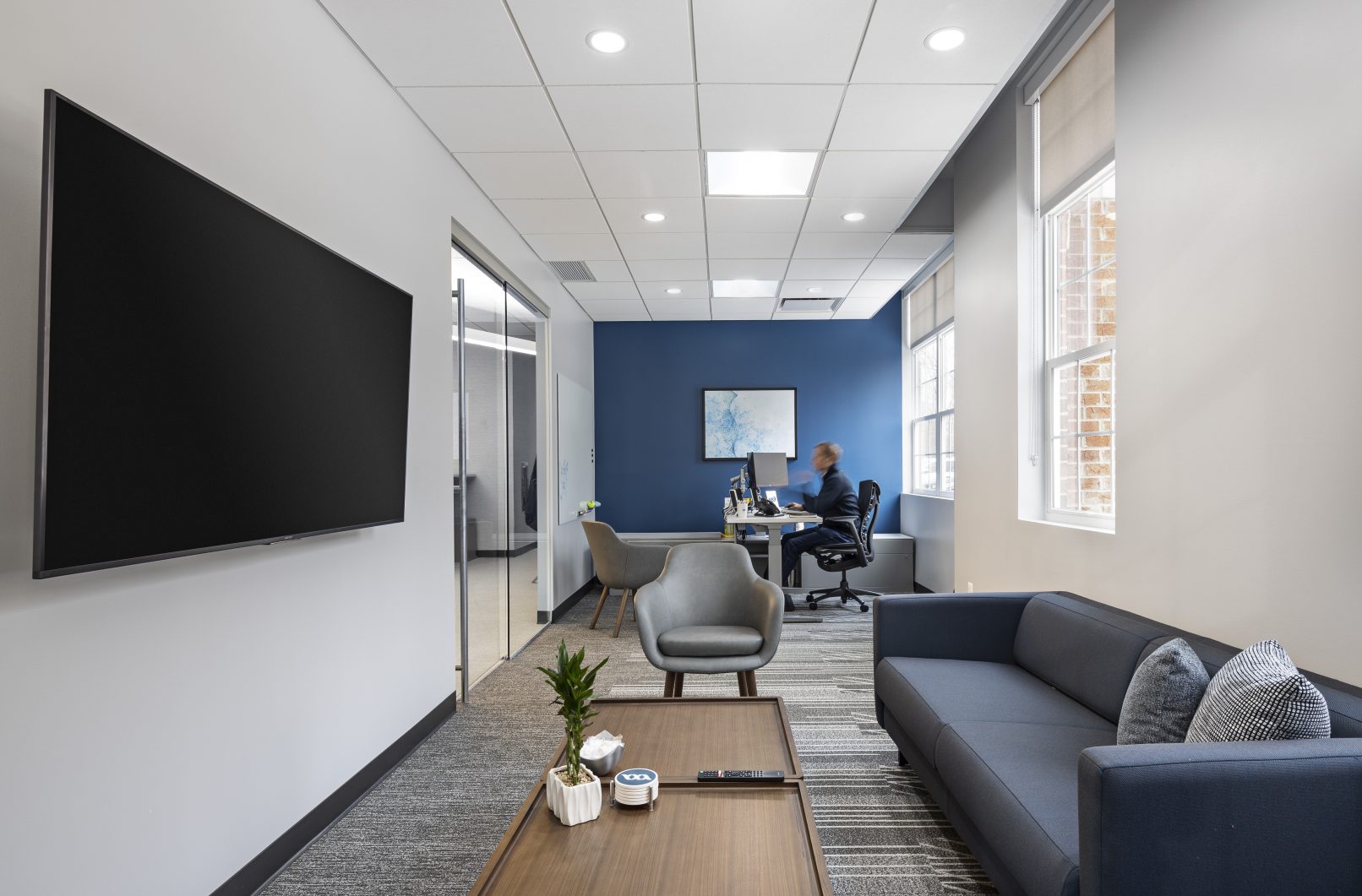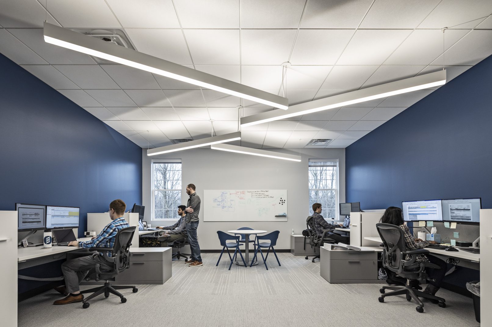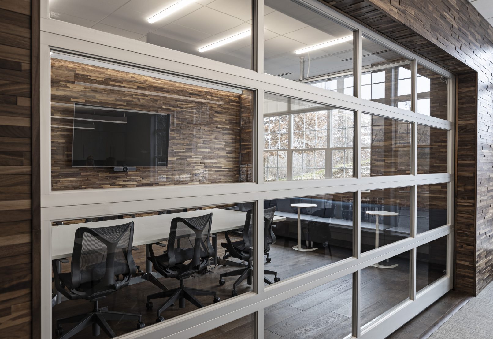 The office spaces are compartmentalized into team areas that promote individual work time or collaborative team efforts. The spaces include mobile furniture and sliding glass walls with integrated technology and multi-stage lighting controls. These offices allow the strata staff to transform work areas for their project needs.