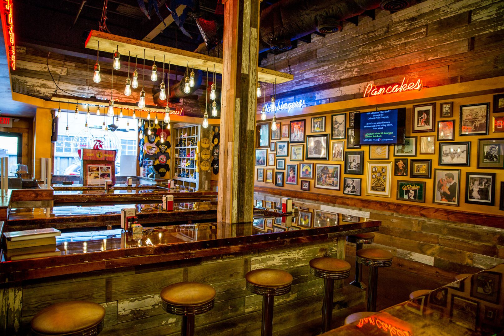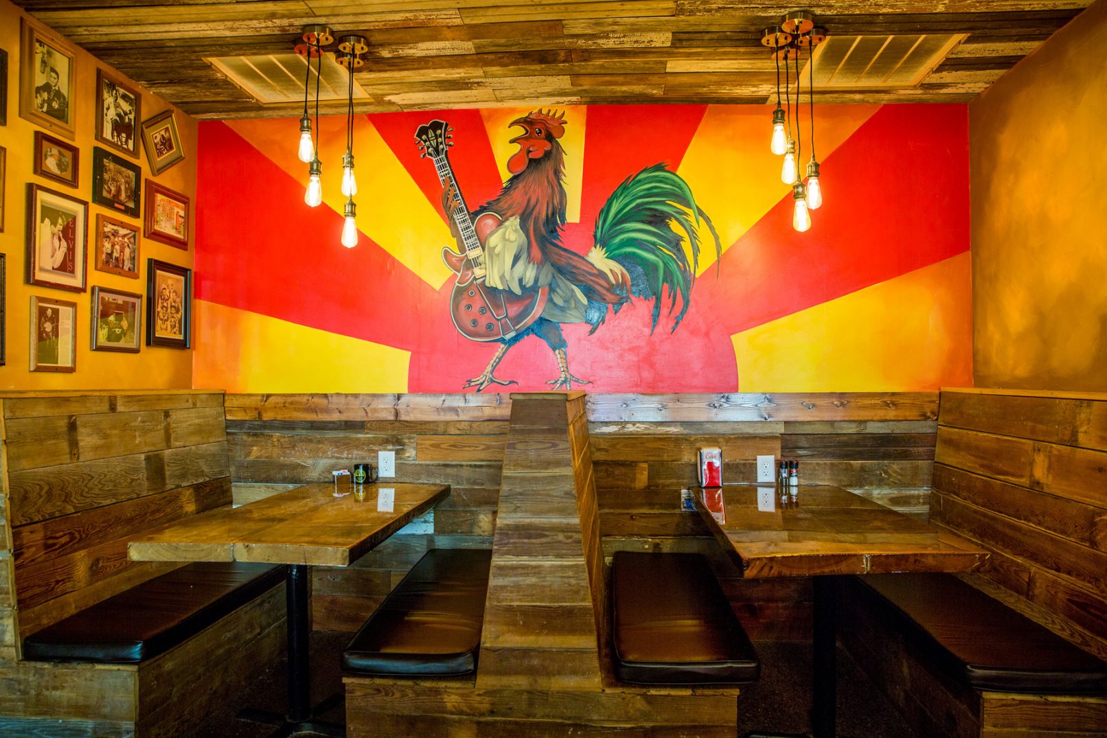 Rich wood on the walls, floors and countertops paired with bright, warm colors throughout were used to create a signature Nashville reclaimed look with a bit of an edge. The painted, signature Sun Records rooster logo on the rear wall draws diners’ eyes through the space where they can also view one of the most extensive Sun Records photo collections of its kind in the nation.