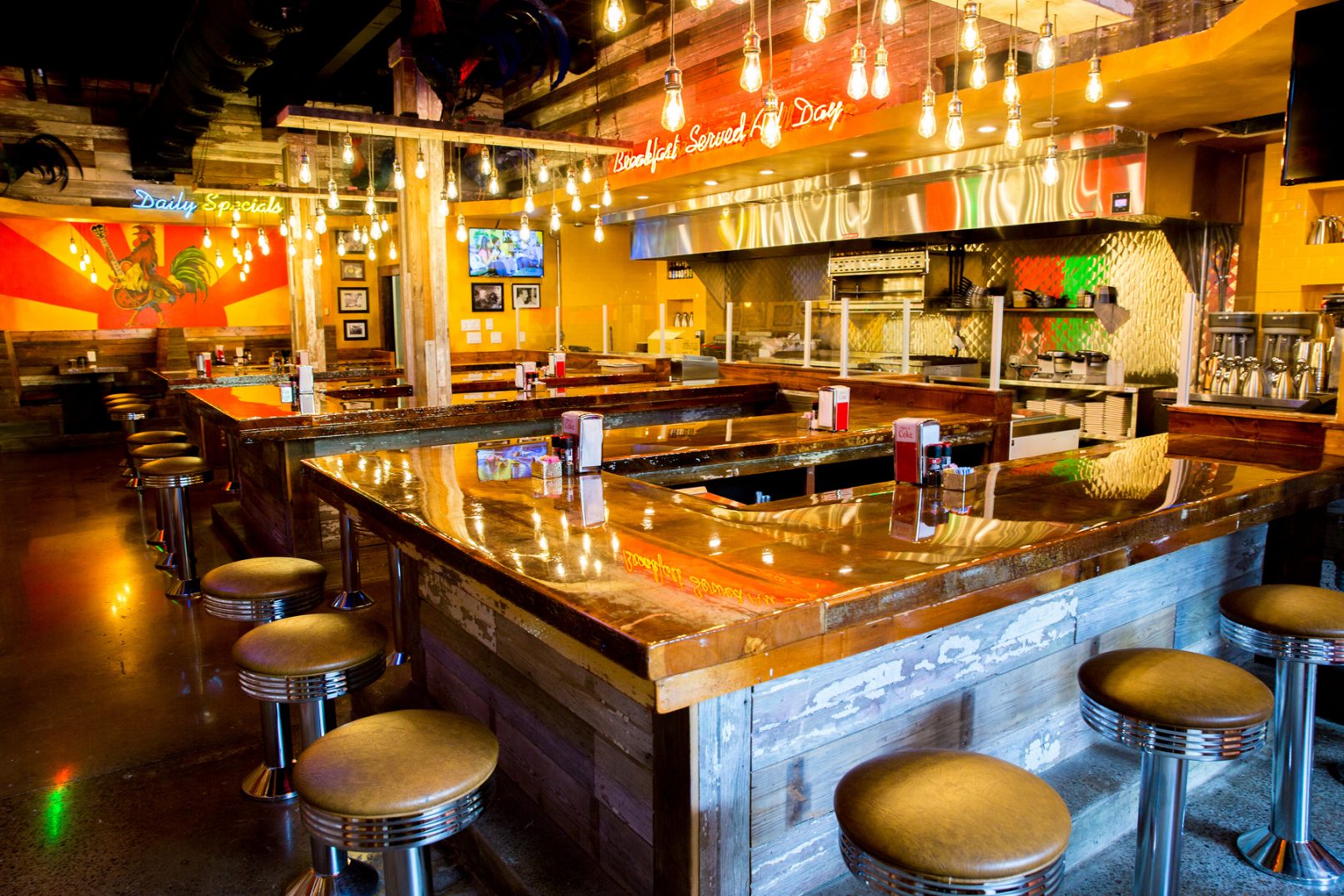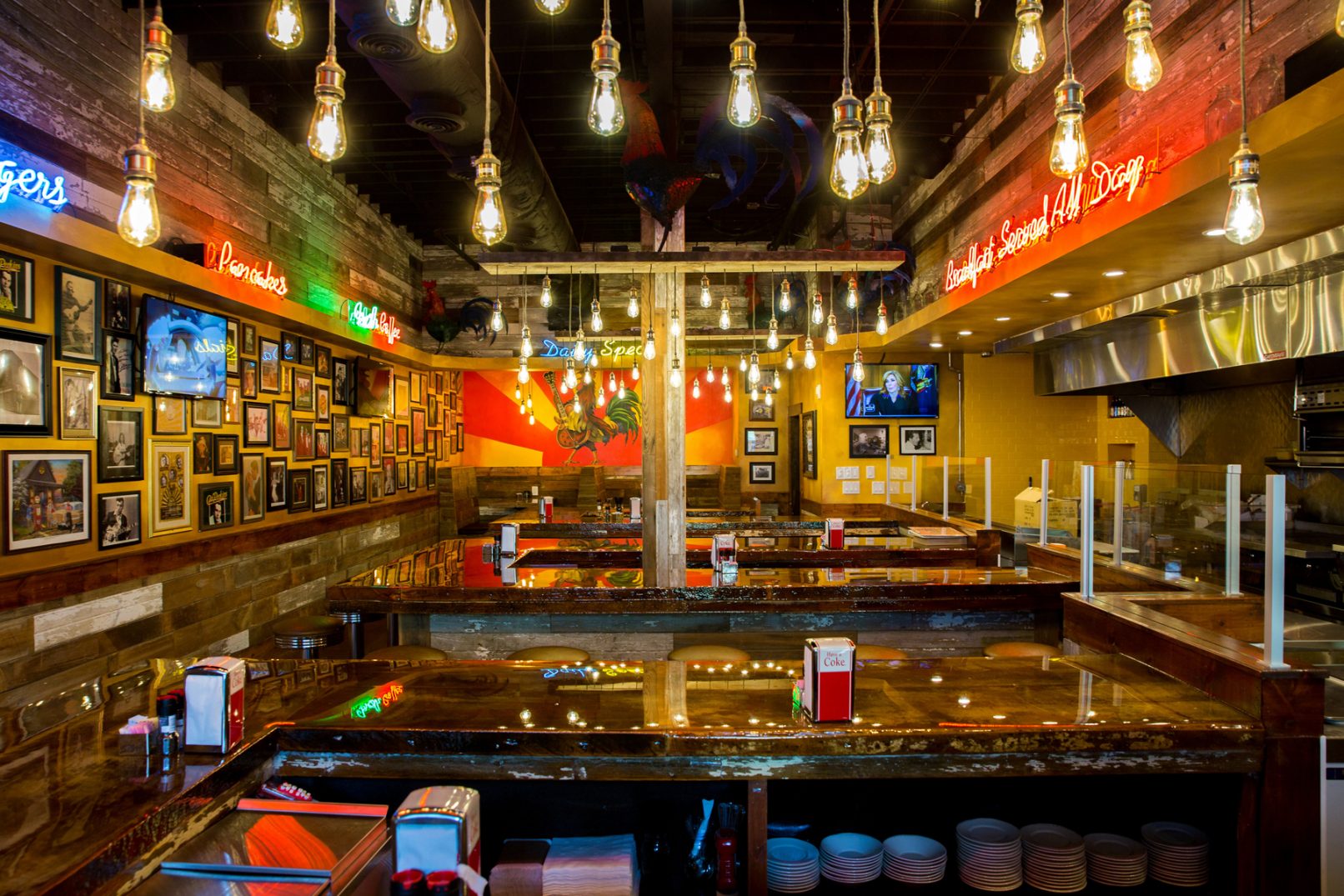 In a “Crispy Crème” meets “Waffle House” concept for a casual, southern-hospitality diner experience, the design focus of the restaurant is on peninsula-shaped counters that allow diners to interact with multiple wait staff and have visual access to everything happening in the kitchen.