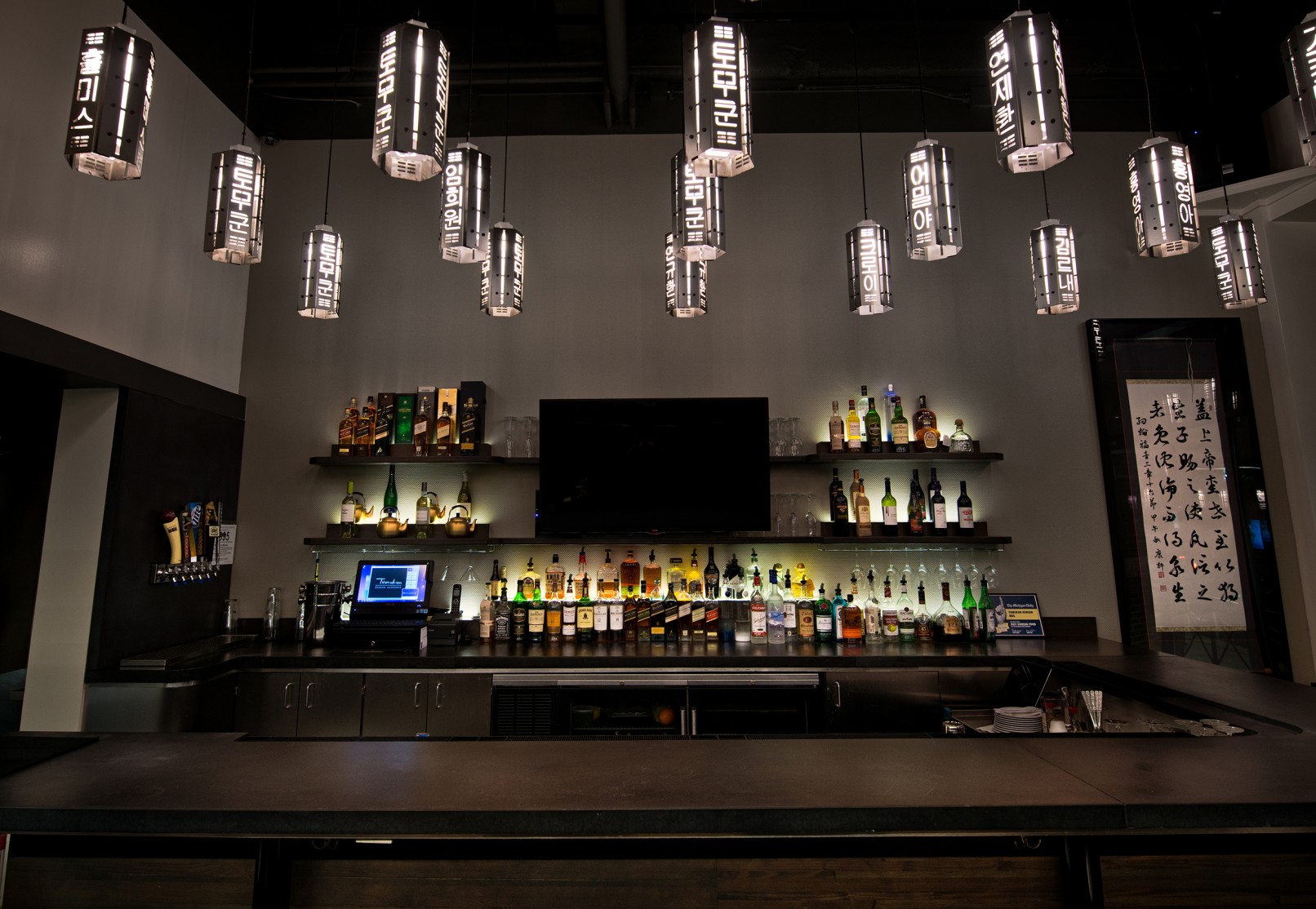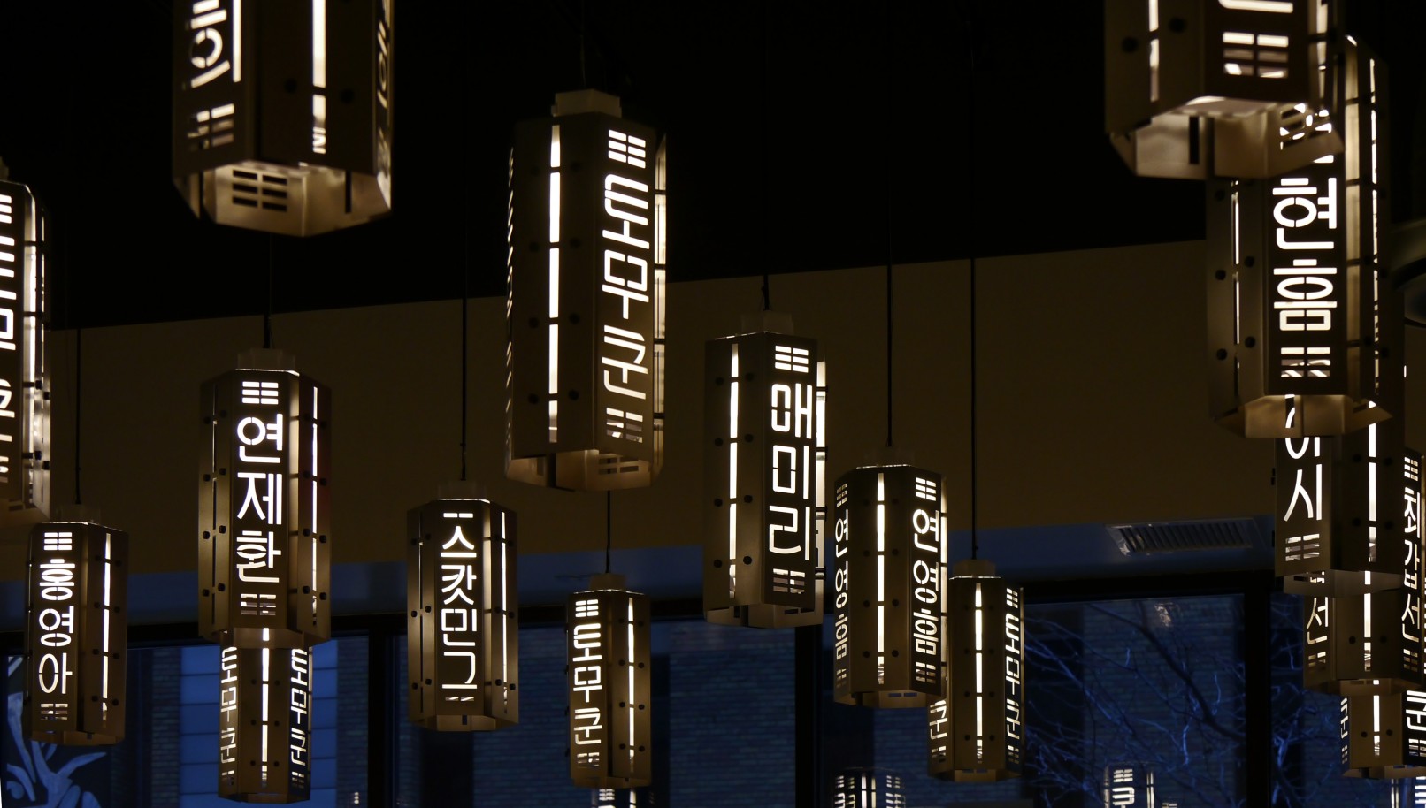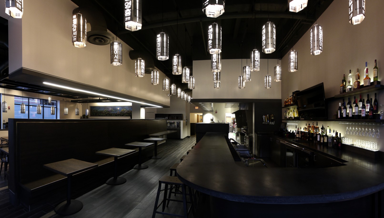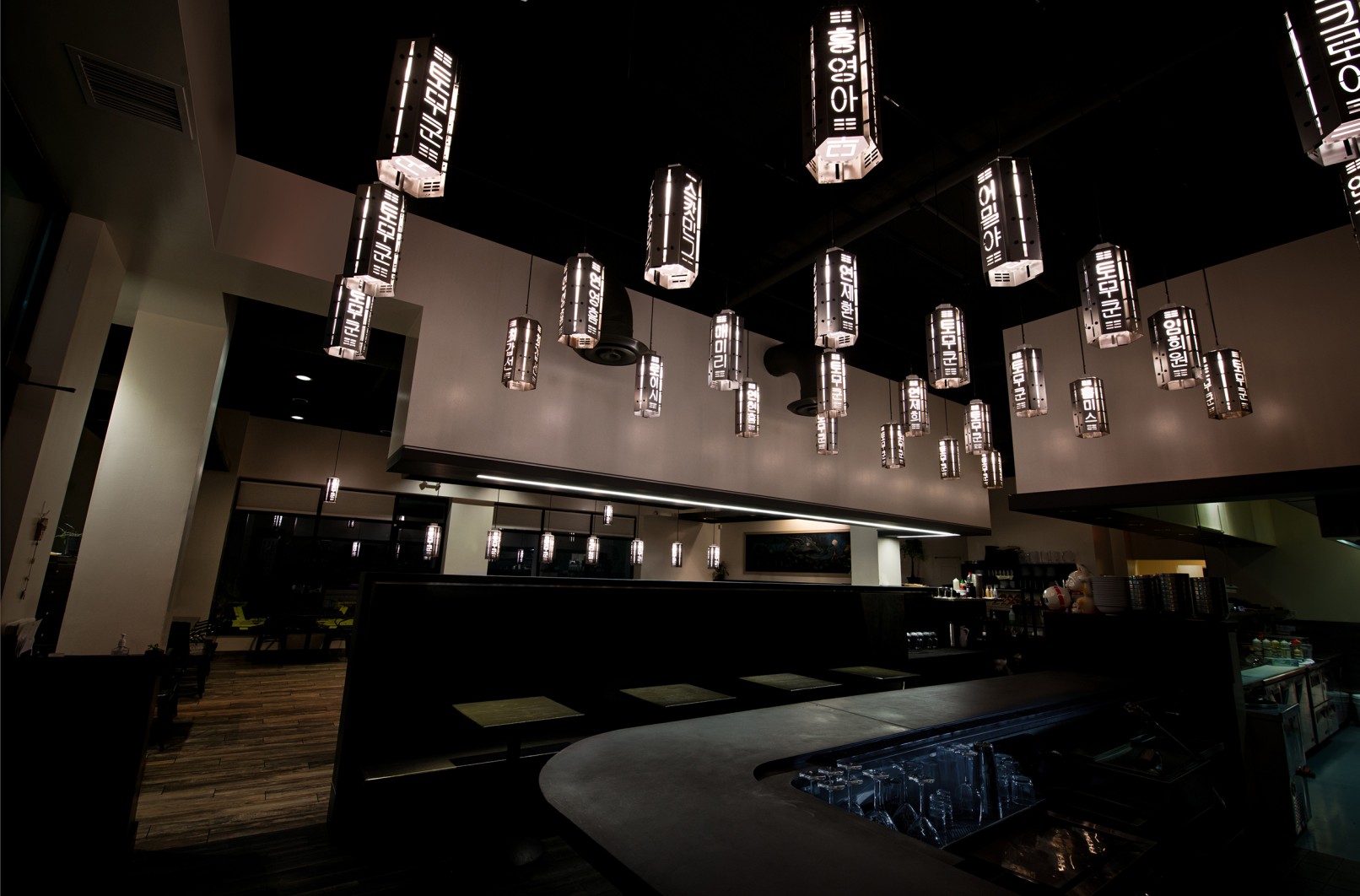 To recreate the atmosphere of a Korean street fair, custom-designed lanterns that mimic traditional paper ones, hang from the ceiling throughout the restaurant. Made of steel and acrylic, each lantern features the names of friends and benefactors of the restaurant.