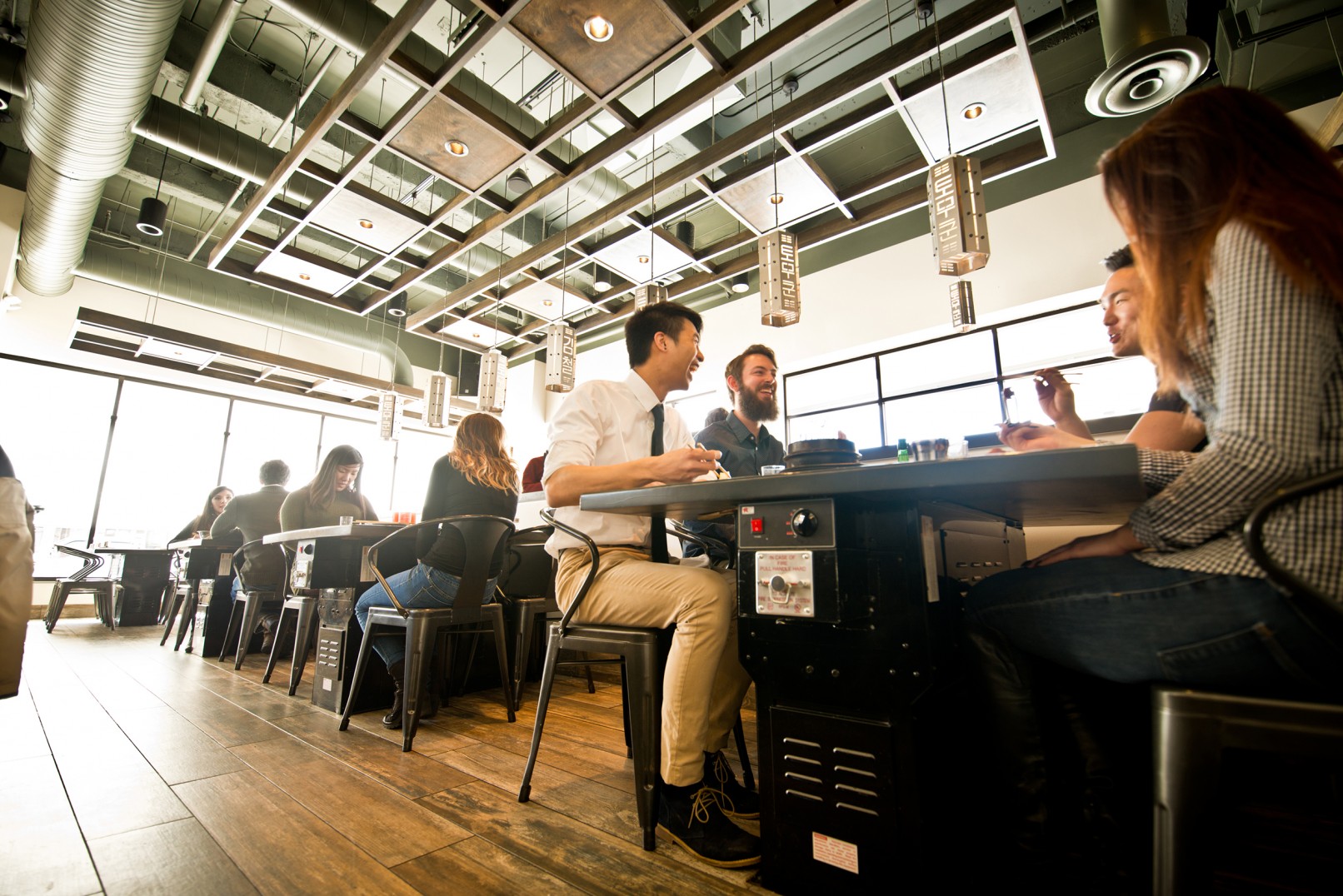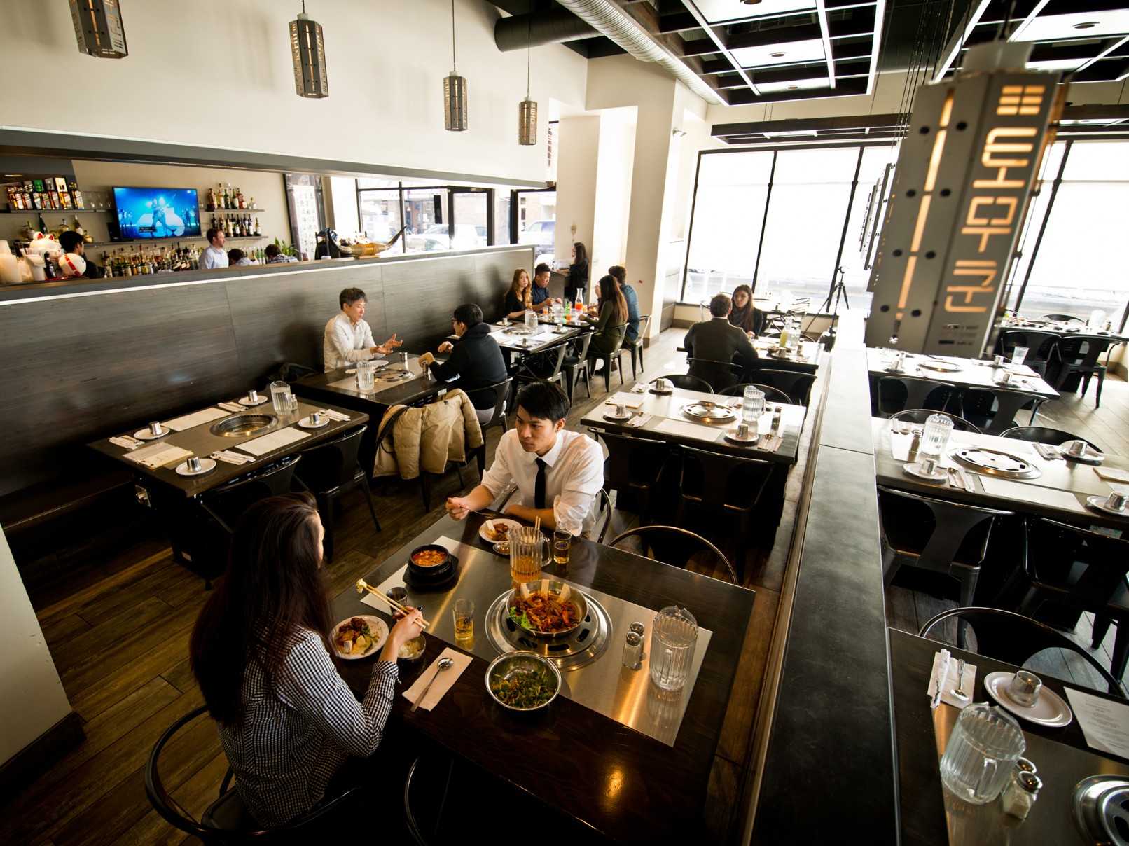 An up-market Korean barbeque restaurant designed around family dining, Tomukun features gas-fired grills in each table. While this typically requires exposed exhaust hoods that clutter the ceiling, drown out conversation and still allow food smells to linger, the use of downdraft grills with an intricate exhaust duct system, routed first through the basement and then to the roof, solves the problem.  Invisible to the customer insight, sound, and smell, the system allowed for a greater design focus on a unique lighting approach.