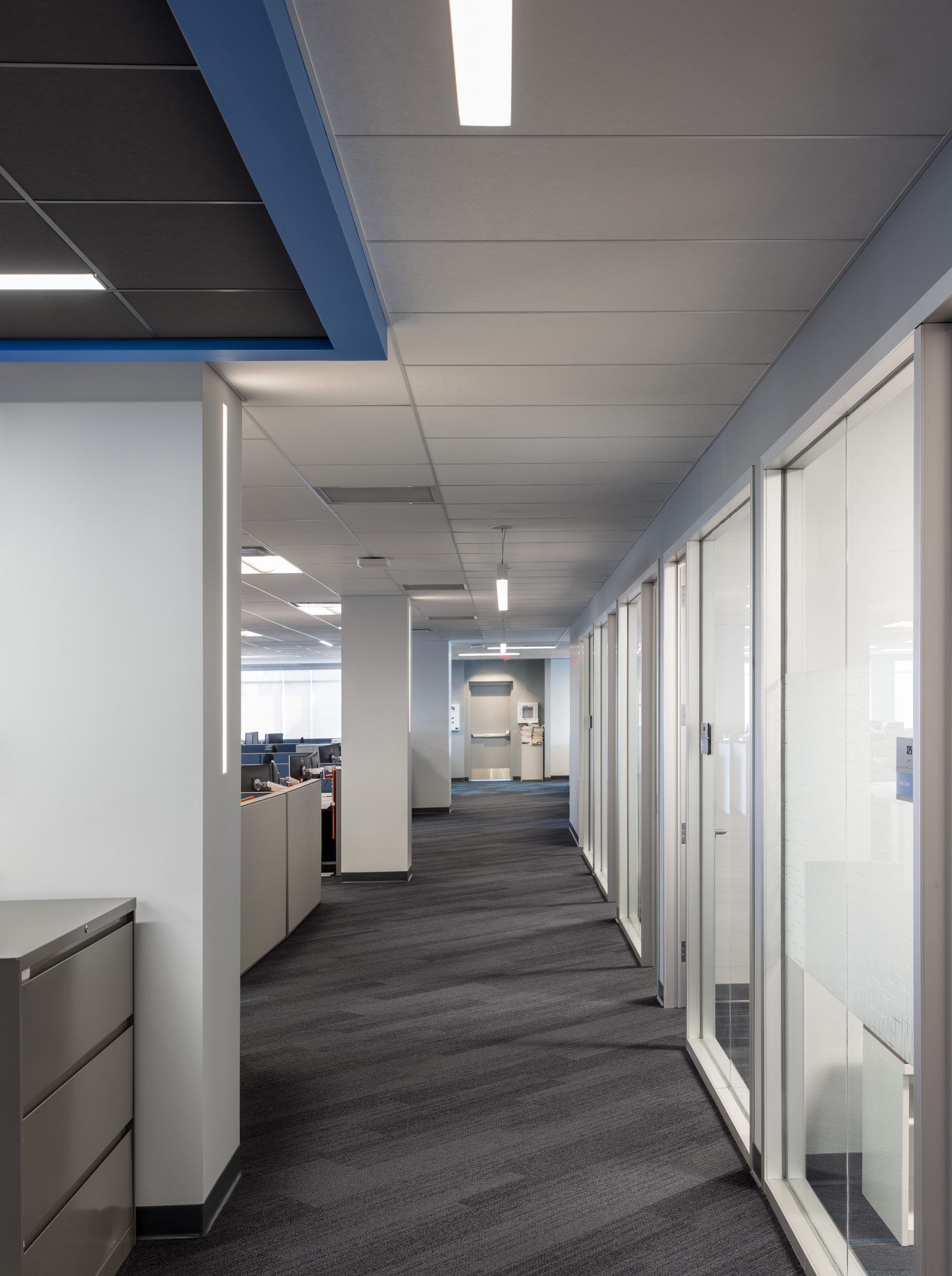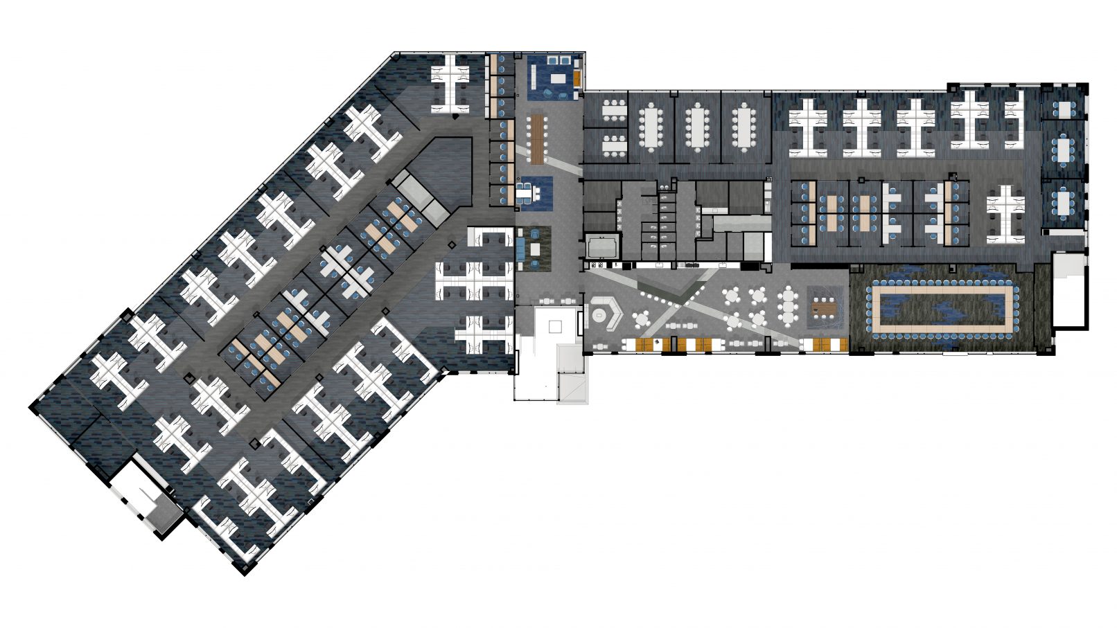 The building was designed as a modern, flexible and functional space for professional offices. The vacant second floor of the building’s core and shell allowed the layout of open offices, team and conference rooms and vast areas for co-working spaces to take place. At the top of the main lobby’s second floor is a floor to ceiling glass storefront. It displays the co-working space of Verint’s main entry while maintaining the modern aesthetics of the current lobby. The main entry serves as a divider between the North and South wing of the second-floor suite. Exterior windows in the coworking entry are clad with a dark wood finish that matches the existing lobby elevator design. The wood finish also frames and complements the wetlands just beyond the building’s footprint. The North wing serves the kitchen and training room that’s divided by a large bi-folding door to create a flexible co-working atmosphere; a top priority for the client. The South wing holds the majority of open office seating, team, phone, and conference rooms. With windows wrapping around most of the exterior walls, Verint’s atmosphere is lively and communal with a design that makes it a productive workplace.