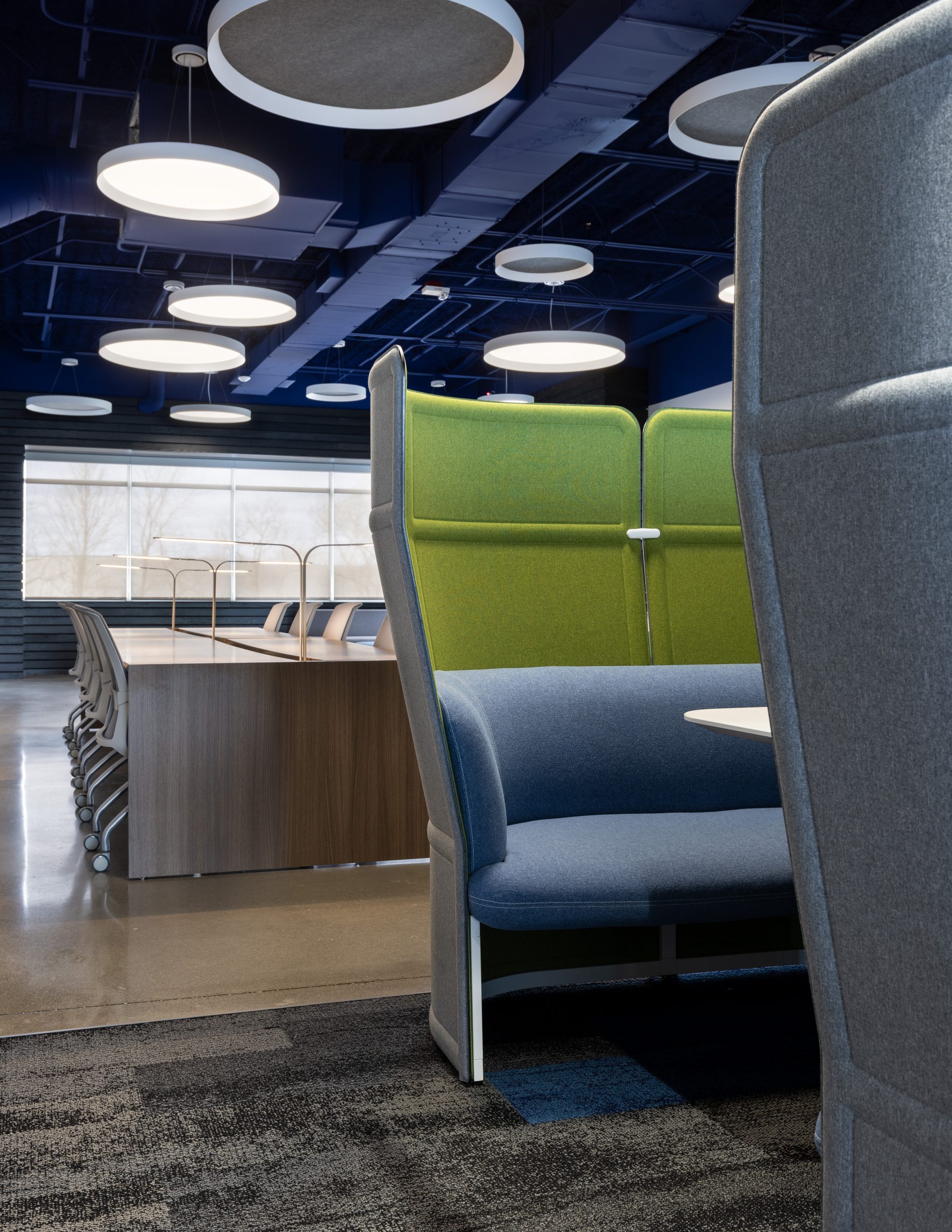 The building was designed as a modern, flexible and functional space for professional offices. The vacant second floor of the building’s core and shell allowed the layout of open offices, team and conference rooms and vast areas for co-working spaces to take place. At the top of the main lobby’s second floor is a floor to ceiling glass storefront. It displays the co-working space of Verint’s main entry while maintaining the modern aesthetics of the current lobby. The main entry serves as a divider between the North and South wing of the second-floor suite. Exterior windows in the coworking entry are clad with a dark wood finish that matches the existing lobby elevator design. The wood finish also frames and complements the wetlands just beyond the building’s footprint. The North wing serves the kitchen and training room that’s divided by a large bi-folding door to create a flexible co-working atmosphere; a top priority for the client. The South wing holds the majority of open office seating, team, phone, and conference rooms. With windows wrapping around most of the exterior walls, Verint’s atmosphere is lively and communal with a design that makes it a productive workplace.