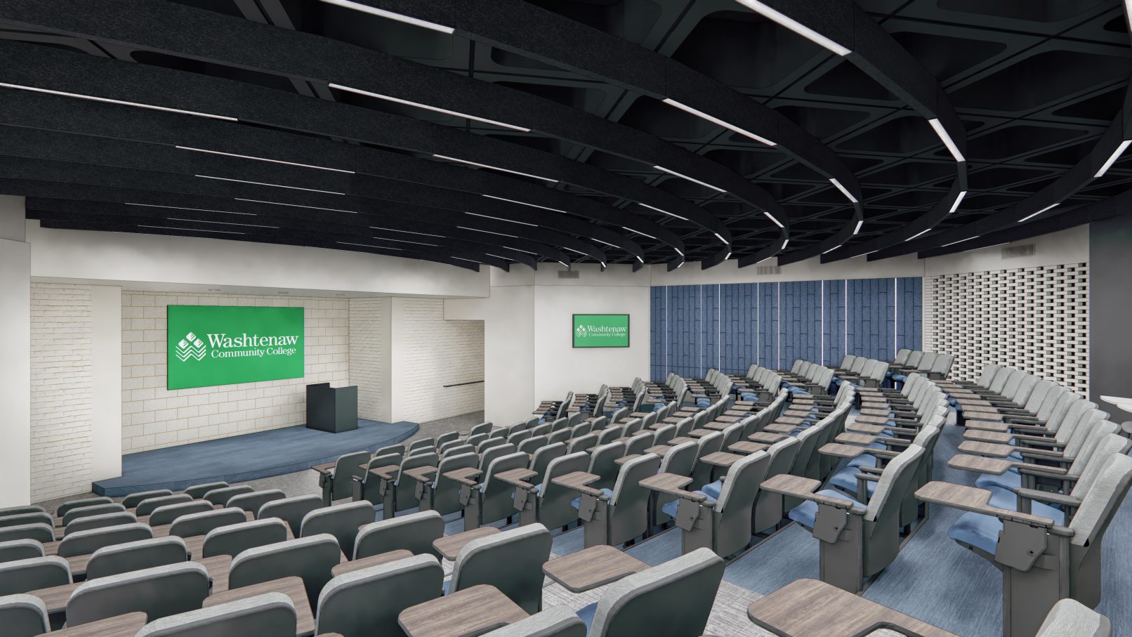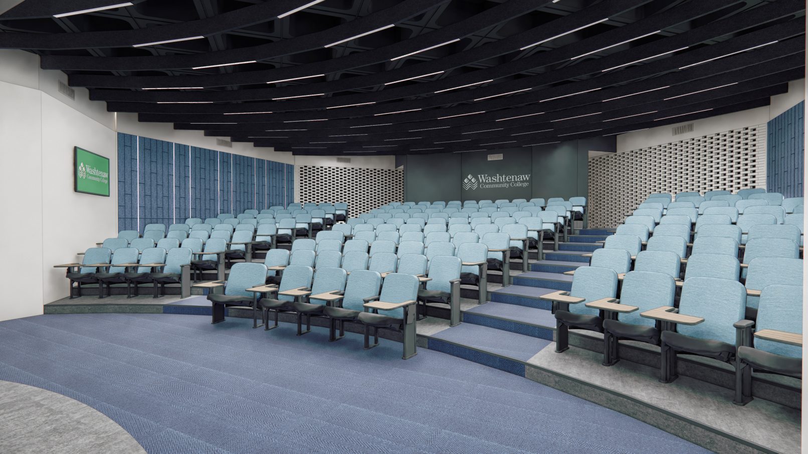 O|X Studio has partnered with PBA and CommTech to provide Architectural and Engineering services for the three existing auditoriums located on each floor of the Crane Liberal Arts and Science Building (CLASB) at Washtenaw Community College. These currently serve a wide range of academic and community functions—from theater and humanities programming on the first floor to lecture halls supporting Life Sciences, Chemistry, Math, and Engineering Technology on the upper levels. The project aims to reimagine each auditorium with modernized aesthetics, improved functionality, and enhanced accessibility, while taking into account the unique instructional needs of each space.
